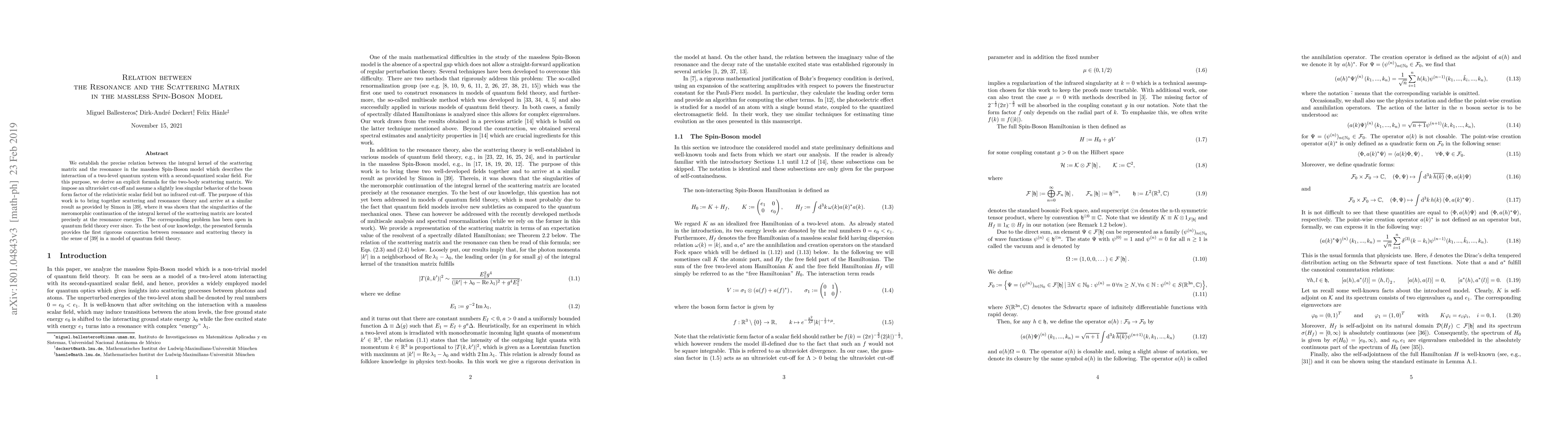 This research establishes a precise relationship between the scattering matrix and resonances in the massless Spin-Boson model, a model describing a two-level quantum system interacting with a scalar field. The study derives an explicit formula for the two-body scattering matrix, introducing an ultraviolet cut-off and assuming a specific boson form factor behavior. It connects resonance theory with scattering theory, providing the first rigorous link between the two in quantum field theory, addressing an open problem since Simon's work in [38].
