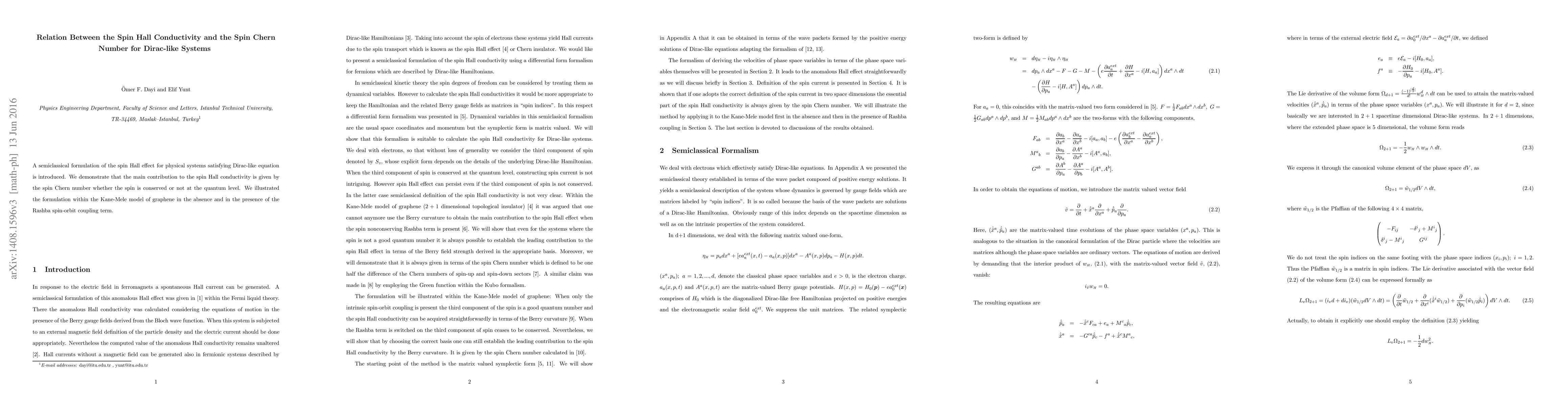 A semiclassical formulation of the spin Hall effect for physical systems satisfying Dirac-like equation is introduced. We demonstrated that the main contribution to the spin Hall conductivity is given by the spin Chern number whether the spin is conserved or not at the quantum level. We illustrated the formulation within the Kane-Mele model of graphene in the absence and in the presence of the Rashba spin-orbit coupling term.