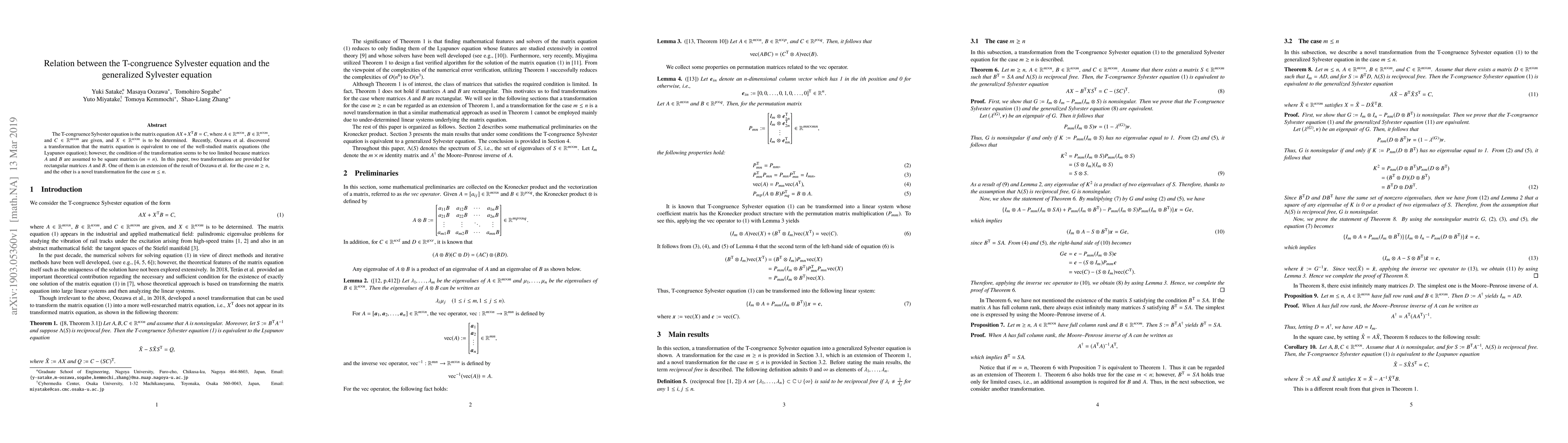 This paper explores transformations linking the T-congruence Sylvester equation to the generalized Sylvester equation, extending previous results by Oozawa et al. It provides two new transformations for rectangular matrices, one for $m \ge n$ and another for $m \le n$.