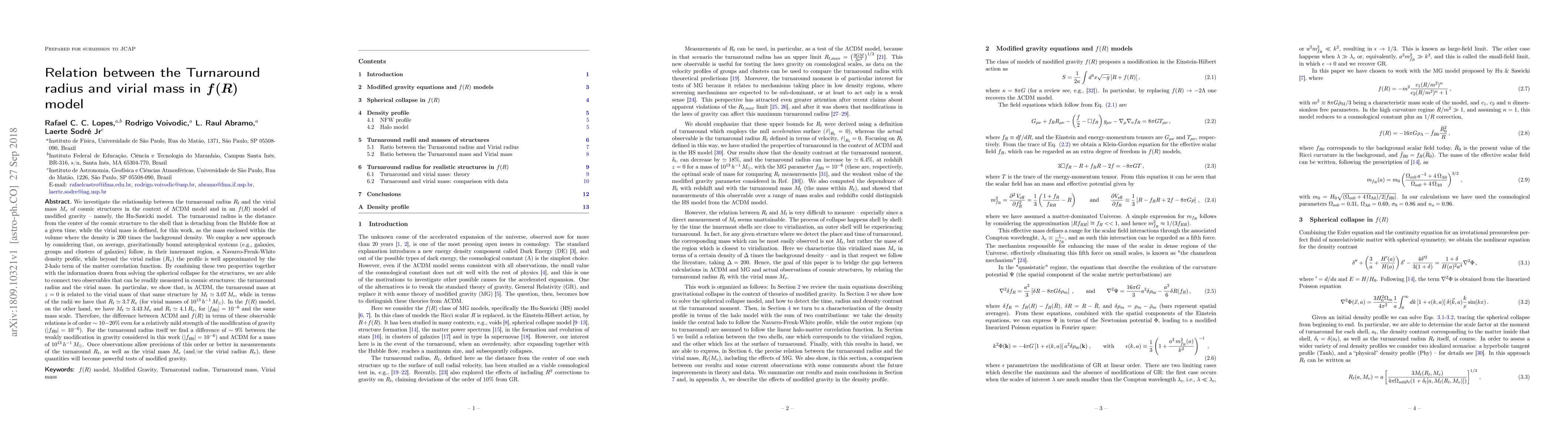 This paper explores how the turnaround radius and virial mass of cosmic structures differ between a modified gravity model (f(R)) and the LambdaCDM model, with implications for testing gravity theories.
