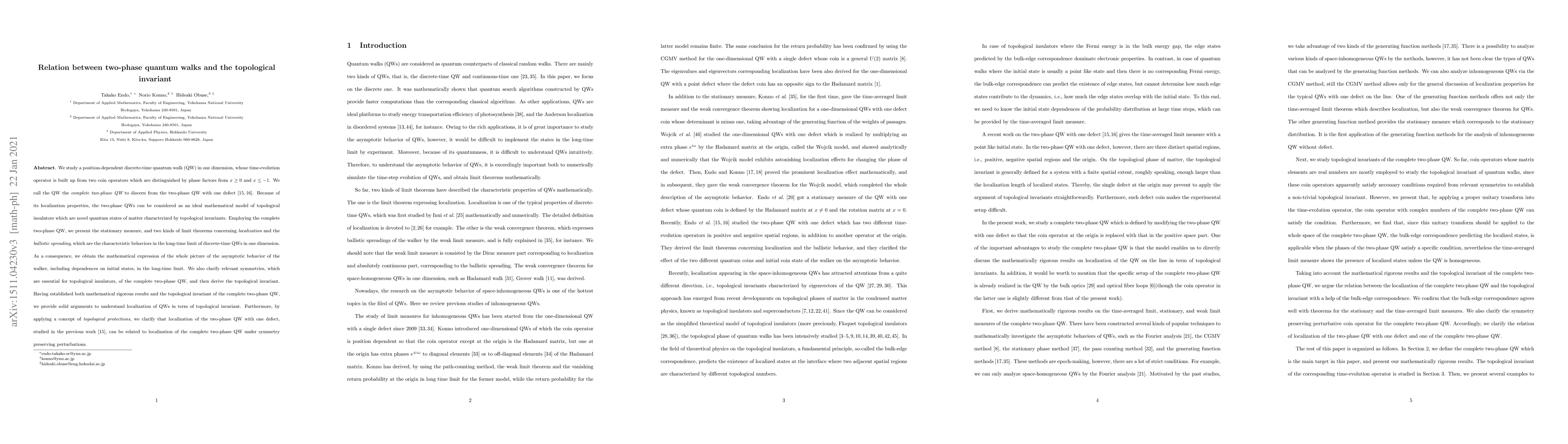 We study a position-dependent discrete-time quantum walk (QW) in one dimension, whose time-evolution operator is built up from two coin operators which are distinguished by phase factors from $x\geq0$ and $x\leq-1$. We call the QW the {\it complete two-phase QW} to discern from the two-phase QW with one defect\cite{endosan,maman}. Because of its localization properties, the two-phase QWs can be considered as an ideal mathematical model of topological insulators which are novel quantum states of matter characterized by topological invariants. Employing the complete two-phase QW, we present the stationary measure, and two kinds of limit theorems concerning {\it localization} and the {\it ballistic spreading}, which are the characteristic behaviors in the long-time limit of discrete-time QWs in one dimension. As a consequence, we obtain the mathematical expression of the whole picture of the asymptotic behavior of the walker, including dependences on initial states, in the long-time limit. We also clarify relevant symmetries, which are essential for topological insulators, of the complete two-phase QW, and then derive the topological invariant. Having established both mathematical rigorous results and the topological invariant of the complete two-phase QW, we provide solid arguments to understand localization of QWs in term of topological invariant. Furthermore, by applying a concept of {\it topological protections}, we clarify that localization of the two-phase QW with one defect, studied in the previous work\cite{endosan}, can be related to localization of the complete two-phase QW under symmetry preserving perturbations.