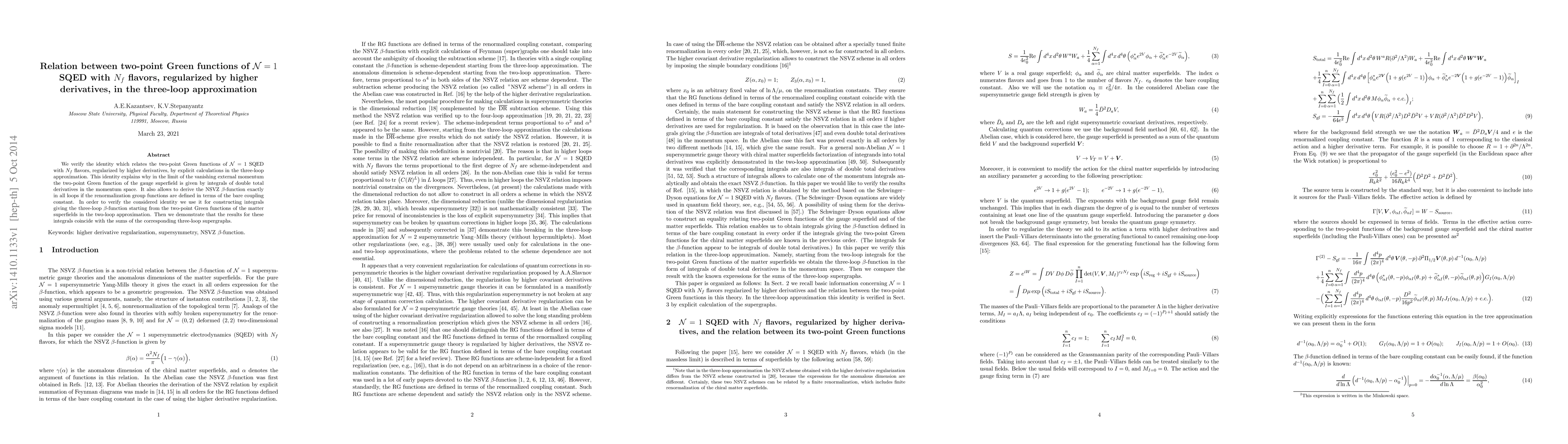 This paper verifies an identity relating two-point Green functions in ${\cal N}=1$ SQED with $N_f$ flavors, using three-loop calculations. The identity clarifies the behavior of the gauge superfield's Green function at zero external momentum and enables the exact derivation of the NSVZ $\beta$-function across all loops.