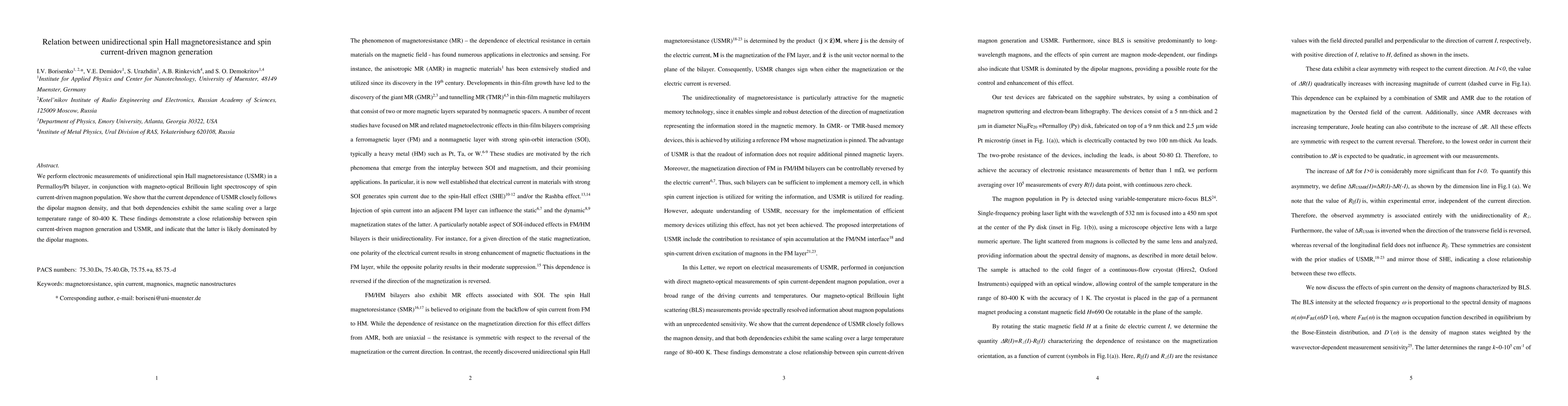 This study investigates the relationship between unidirectional spin Hall magnetoresistance (USMR) and spin current-driven magnon generation in a Permalloy/Pt bilayer. Results show that USMR closely follows the dipolar magnon density, indicating a strong correlation between the two phenomena over a temperature range of 80-400 K.