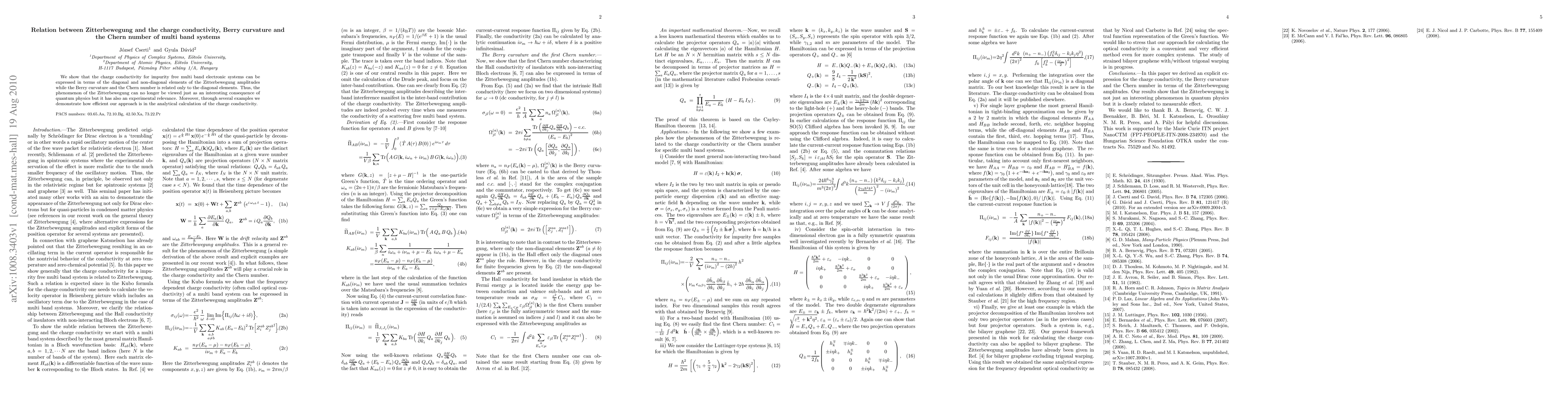 We show that the charge conductivity for impurity free multi band electronic systems can be expressed in terms of the diagonal and non-diagonal elements of the Zitterbewegung amplitudes while the Berry curvature and the Chern number is related only to the diagonal elements. Thus, the phenomenon of the Zitterbewegung can no longer be viewed just as an interesting consequence of quantum physics but it has also an experimental relevance. Moreover, through several examples we demonstrate how efficient our approach is in the analytical calculation of the charge conductivity.