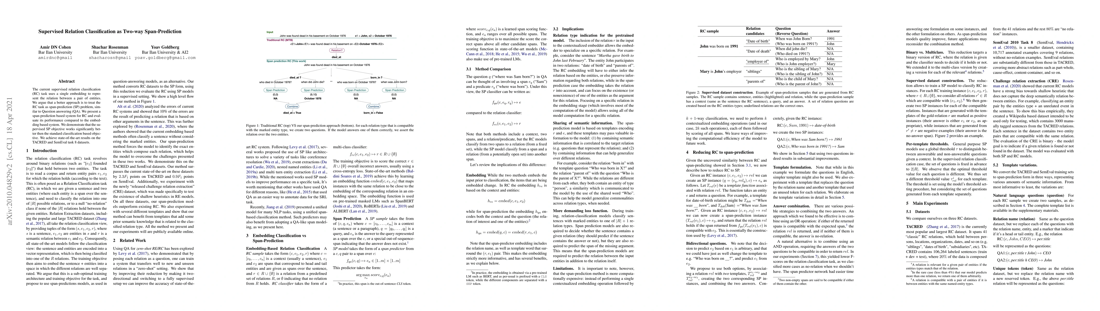 A new approach to relation classification treats it as a span-prediction problem, outperforming traditional embedding-based methods with state-of-the-art results on TACRED and SemEval datasets.