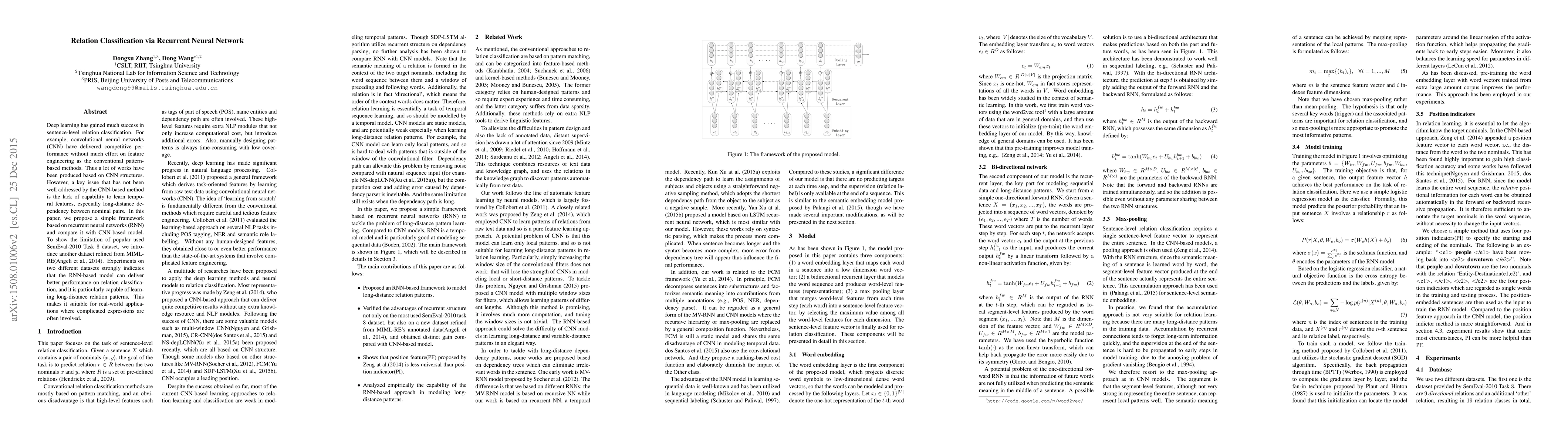 This paper proposes a recurrent neural network (RNN) framework for sentence-level relation classification, demonstrating superior performance over CNN-based models, especially in capturing long-distance dependencies. Experiments on two datasets show that RNNs are better suited for complex real-world applications.