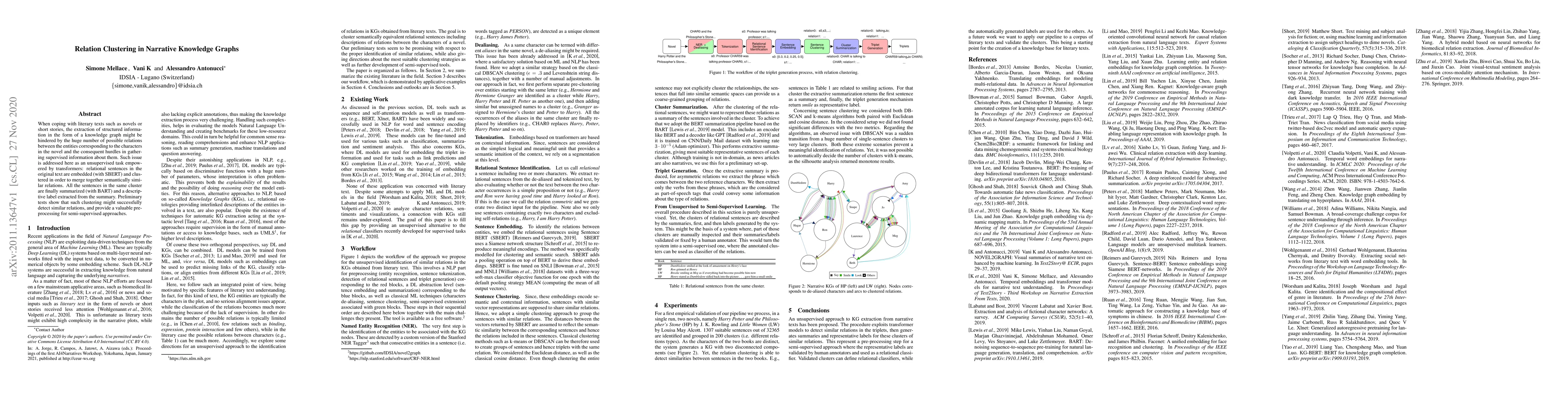 When coping with literary texts such as novels or short stories, the extraction of structured information in the form of a knowledge graph might be hindered by the huge number of possible relations between the entities corresponding to the characters in the novel and the consequent hurdles in gathering supervised information about them. Such issue is addressed here as an unsupervised task empowered by transformers: relational sentences in the original text are embedded (with SBERT) and clustered in order to merge together semantically similar relations. All the sentences in the same cluster are finally summarized (with BART) and a descriptive label extracted from the summary. Preliminary tests show that such clustering might successfully detect similar relations, and provide a valuable preprocessing for semi-supervised approaches.