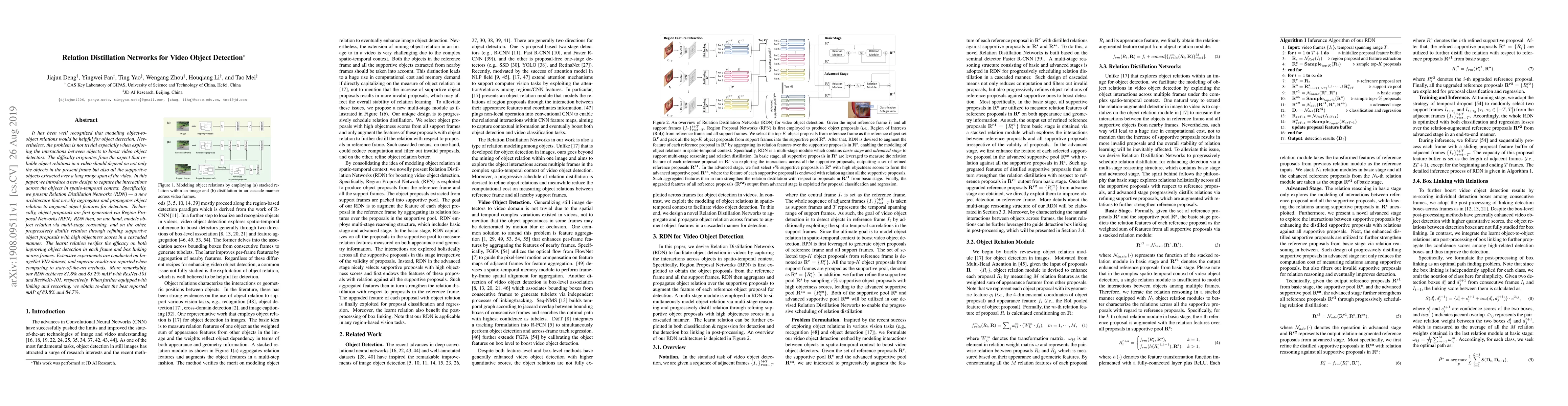 This paper introduces Relation Distillation Networks (RDN) to enhance video object detection by modeling object-to-object relations across frames. RDN aggregates and refines object relations through multi-stage reasoning and cascading distillation, achieving superior detection performance on the ImageNet VID dataset, outperforming state-of-the-art methods.