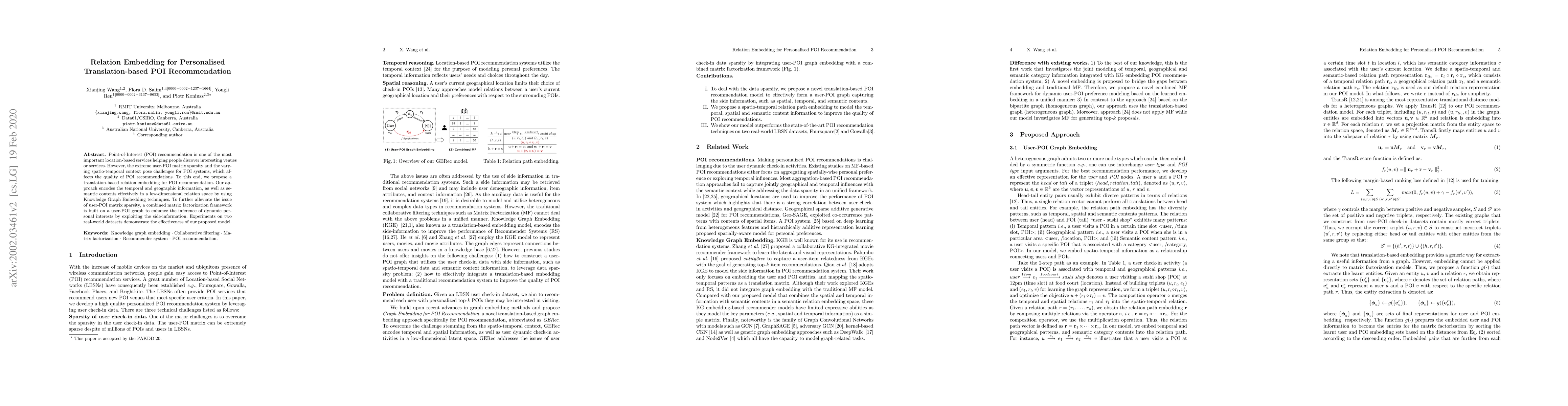 This paper proposes a translation-based relation embedding method for personalised POI recommendation that effectively encodes temporal, geographic, and semantic information using Knowledge Graph Embedding. A combined matrix factorization framework enhances dynamic interest inference, addressing the challenge of user-POI matrix sparsity, and is shown to improve recommendation quality through experiments on real-world datasets.