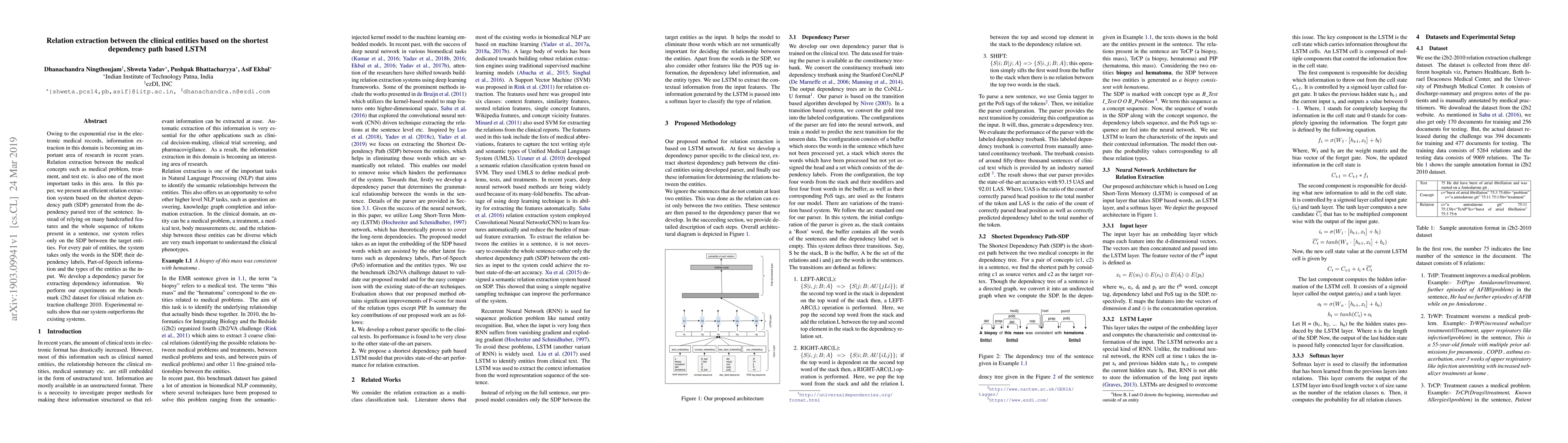 This paper proposes a relation extraction system that leverages the shortest dependency path (SDP) from dependency parsed trees, using only this path and associated features for improved performance, outperforming existing methods on the i2b2 dataset.