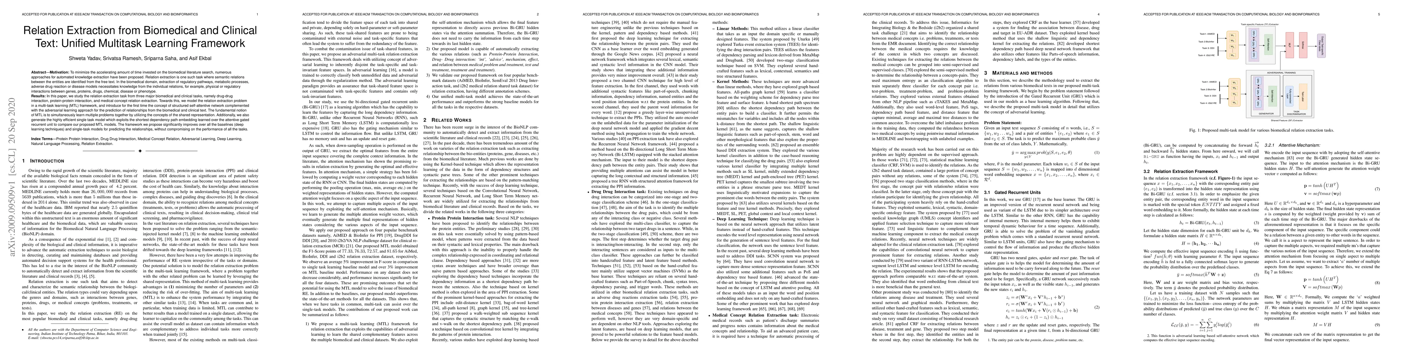 This paper proposes a unified multitask learning framework for relation extraction in biomedical and clinical text, focusing on drug-drug interaction, protein-protein interaction, and medical concept relations. The model employs a structured self-attentive network with adversarial learning, achieving superior performance compared to baseline deep learning techniques and single-task models.