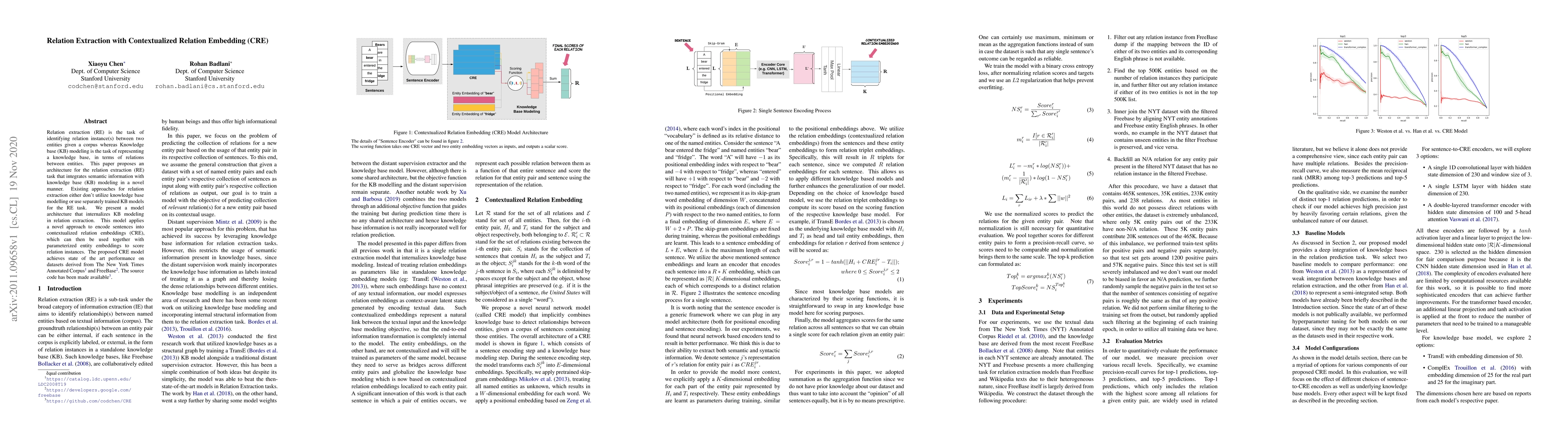 This paper introduces a novel architecture for relation extraction that integrates knowledge base modeling by encoding sentences into contextualized relation embeddings. The proposed CRE model outperforms existing methods on datasets from The New York Times Annotated Corpus and FreeBase, demonstrating its effectiveness in identifying relation instances between entities.