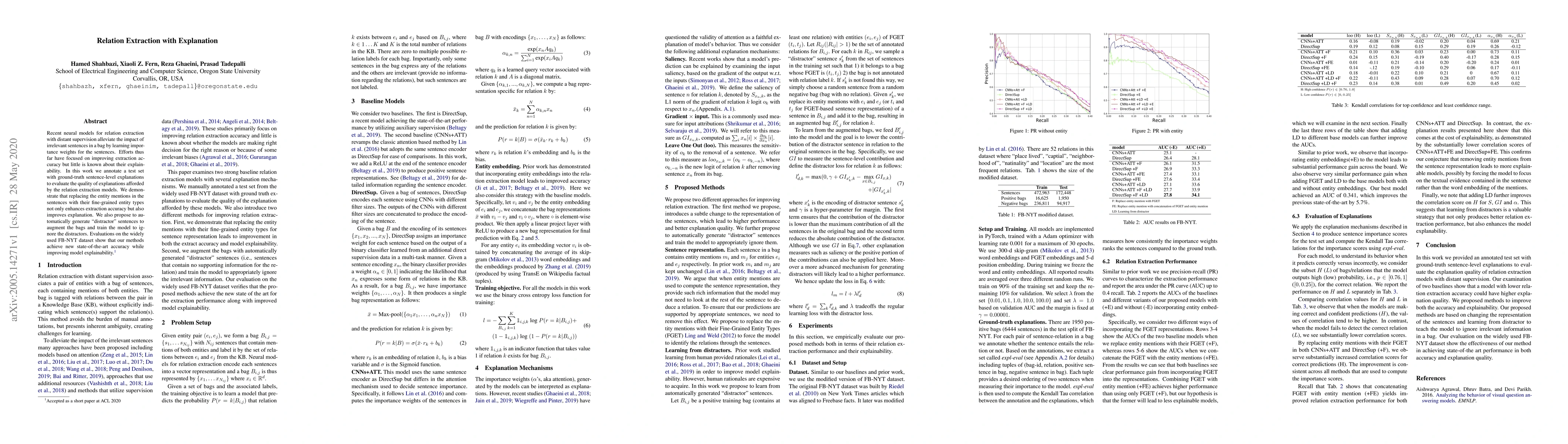 This work distinguishes itself by focusing on enhancing model explainability while maintaining high extraction accuracy, proposing innovative methods like replacing entity mentions with FGET and learning from distractor sentences.