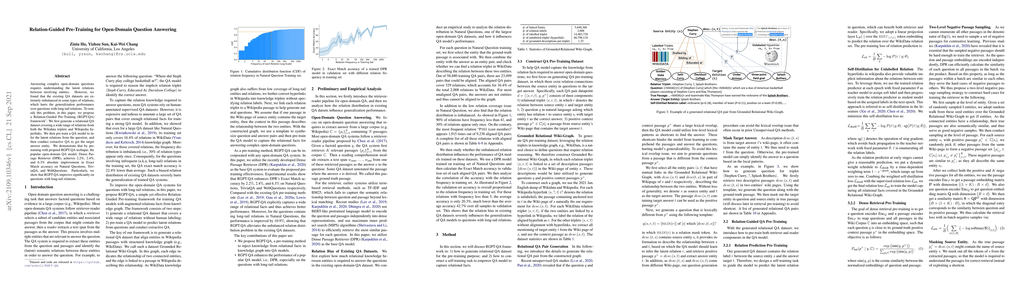 Answering complex open-domain questions requires understanding the latent relations between involving entities. However, we found that the existing QA datasets are extremely imbalanced in some types of relations, which hurts the generalization performance over questions with long-tail relations. To remedy this problem, in this paper, we propose a Relation-Guided Pre-Training (RGPT-QA) framework. We first generate a relational QA dataset covering a wide range of relations from both the Wikidata triplets and Wikipedia hyperlinks. We then pre-train a QA model to infer the latent relations from the question, and then conduct extractive QA to get the target answer entity. We demonstrate that by pretraining with propoed RGPT-QA techique, the popular open-domain QA model, Dense Passage Retriever (DPR), achieves 2.2%, 2.4%, and 6.3% absolute improvement in Exact Match accuracy on Natural Questions, TriviaQA, and WebQuestions. Particularly, we show that RGPT-QA improves significantly on questions with long-tail relations