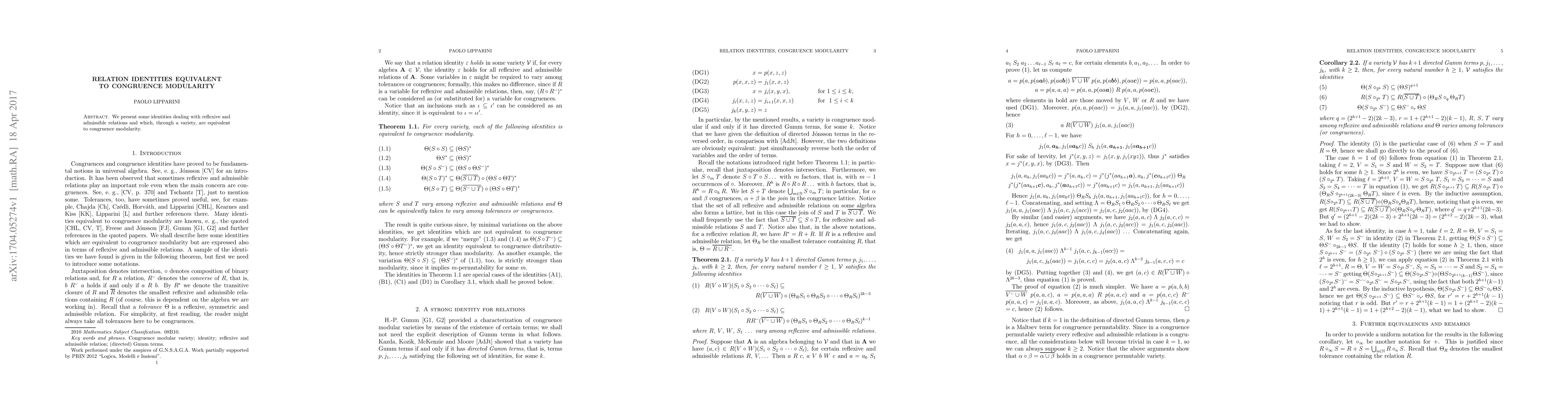This paper explores identities related to reflexive and admissible relations that are equivalent to congruence modularity through a variety. The focus is on establishing these equivalences within the context of algebraic structures.