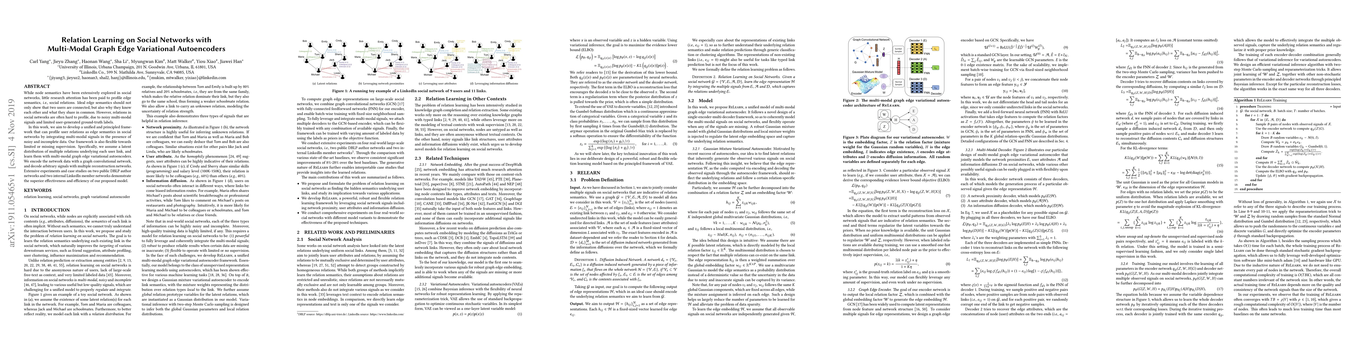 This paper proposes a framework using multi-modal graph edge variational autoencoders to profile user relations in social networks, integrating noisy multi-modal data and handling limited supervision. Experiments on DBLP and LinkedIn networks show the model's effectiveness in capturing underlying user link semantics.