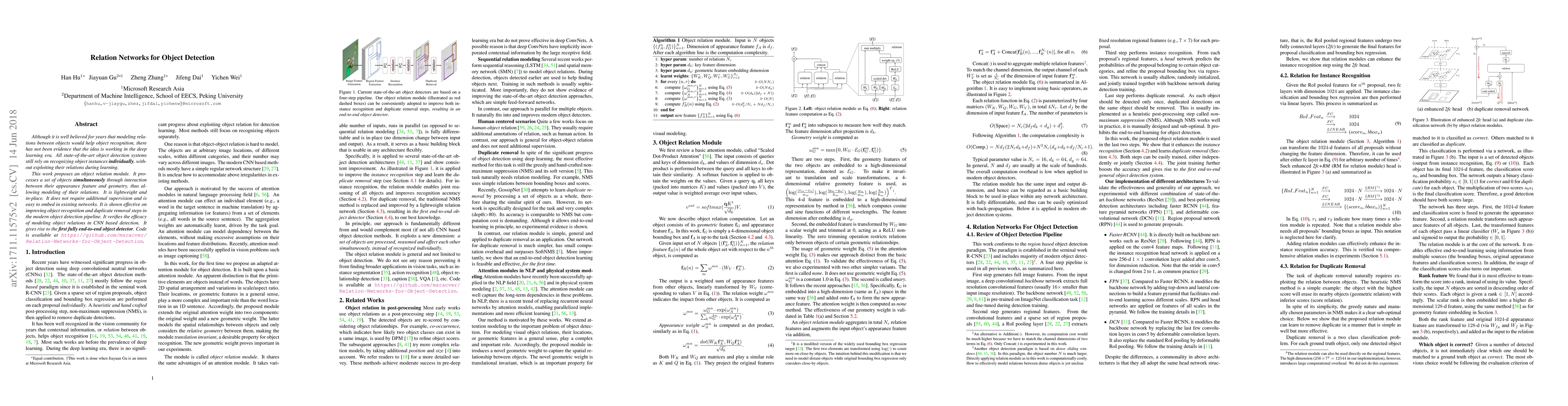 Although it is well believed for years that modeling relations between objects would help object recognition, there has not been evidence that the idea is working in the deep learning era. All state-of-the-art object detection systems still rely on recognizing object instances individually, without exploiting their relations during learning. This work proposes an object relation module. It processes a set of objects simultaneously through interaction between their appearance feature and geometry, thus allowing modeling of their relations. It is lightweight and in-place. It does not require additional supervision and is easy to embed in existing networks. It is shown effective on improving object recognition and duplicate removal steps in the modern object detection pipeline. It verifies the efficacy of modeling object relations in CNN based detection. It gives rise to the first fully end-to-end object detector.