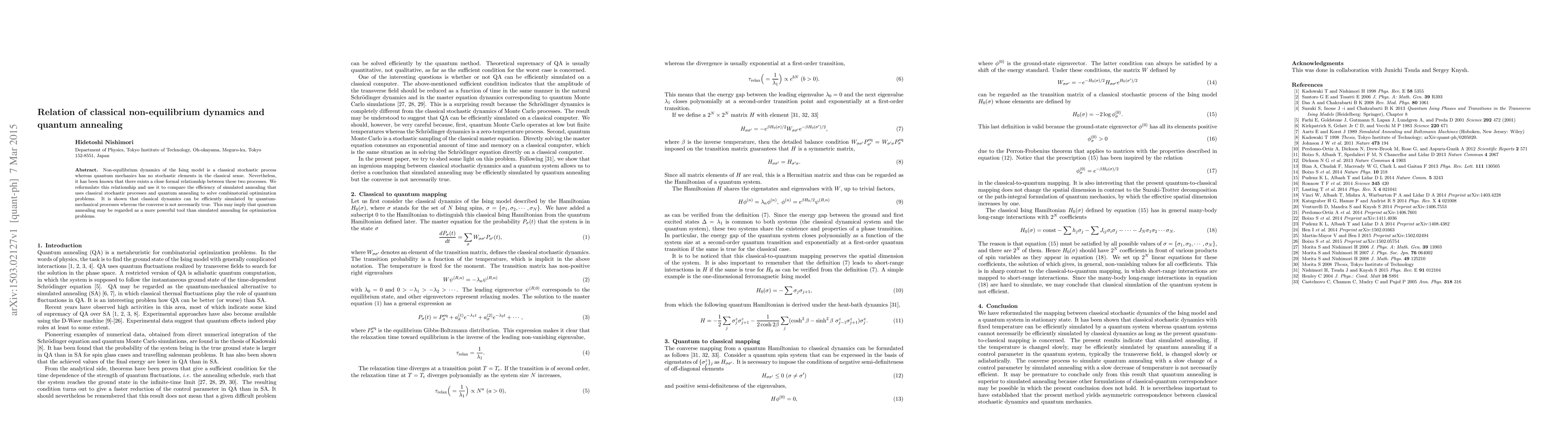 This paper explores the formal relationship between classical non-equilibrium dynamics and quantum annealing, demonstrating that classical simulated annealing can be efficiently simulated by quantum processes, suggesting that quantum annealing may offer superior efficiency for combinatorial optimization problems.