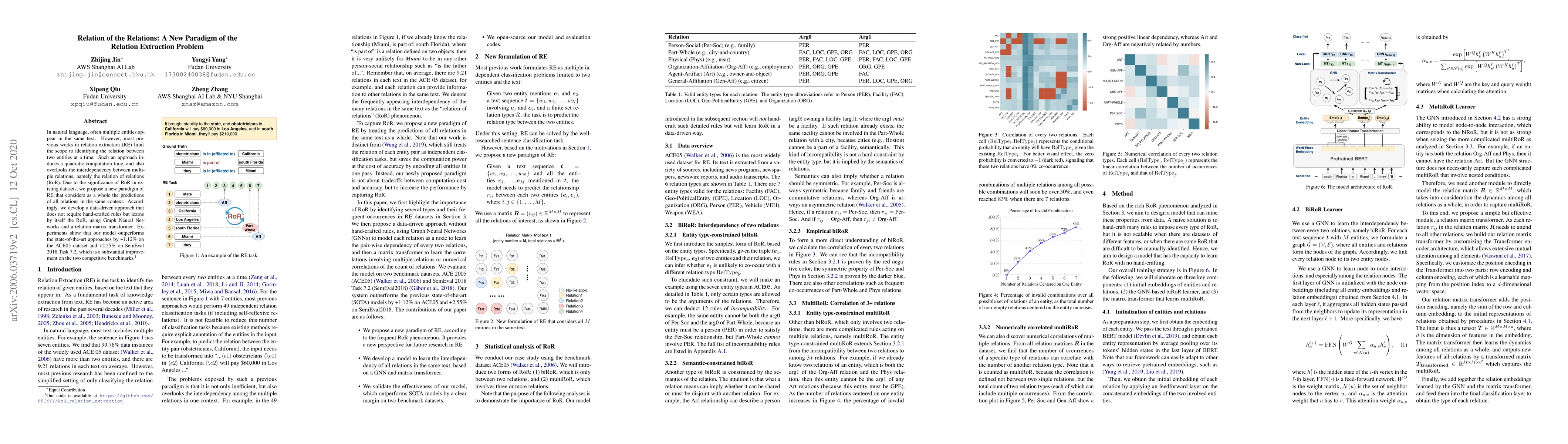 In natural language, often multiple entities appear in the same text. However, most previous works in Relation Extraction (RE) limit the scope to identifying the relation between two entities at a time. Such an approach induces a quadratic computation time, and also overlooks the interdependency between multiple relations, namely the relation of relations (RoR). Due to the significance of RoR in existing datasets, we propose a new paradigm of RE that considers as a whole the predictions of all relations in the same context. Accordingly, we develop a data-driven approach that does not require hand-crafted rules but learns by itself the RoR, using Graph Neural Networks and a relation matrix transformer. Experiments show that our model outperforms the state-of-the-art approaches by +1.12\% on the ACE05 dataset and +2.55\% on SemEval 2018 Task 7.2, which is a substantial improvement on the two competitive benchmarks.