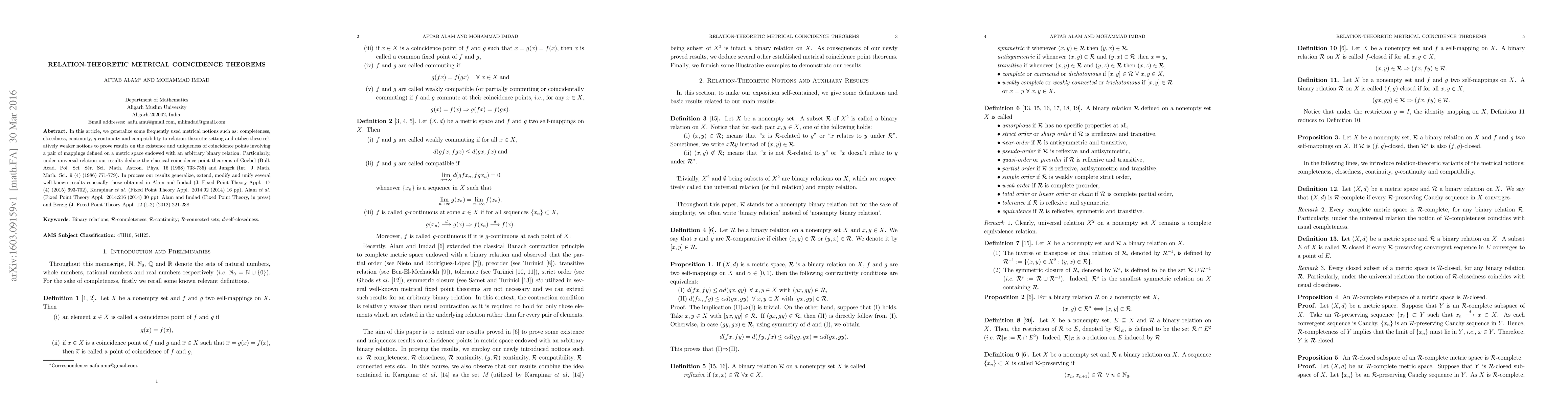 In this article, we generalize some frequently used metrical notions such as: completeness, closedness, continuity, g-continuity and compatibility to relation-theoretic setting and utilize these relatively weaker notions to prove results on the existence and uniqueness of coincidence points involving a pair of mappings defined on a metric space endowed with an arbitrary binary relation. Particularly, under universal relation our results deduce the classical coincidence point theorems of Goebel (Bull. Acad. Pol. Sci. Ser. Sci. Math. Astron. Phys. 16 (1968) 733-735) and Jungck (Int. J. Math. Math. Sci. 9 (4) (1986) 771-779). In process our results generalize, extend, modify and unify several well-known results especially those obtained in Alam and Imdad (J. Fixed Point Theory Appl. 17 (4) (2015) 693-702), Karapinar et al: (Fixed Point Theory Appl. 2014:92 (2014) 16 pp), Alam et al: (Fixed Point Theory Appl. 2014:216 (2014) 30 pp), Alam and Imdad (Fixed Point Theory, in press) and Berzig (J. Fixed Point Theory Appl. 12 (1-2) (2012) 221-238.