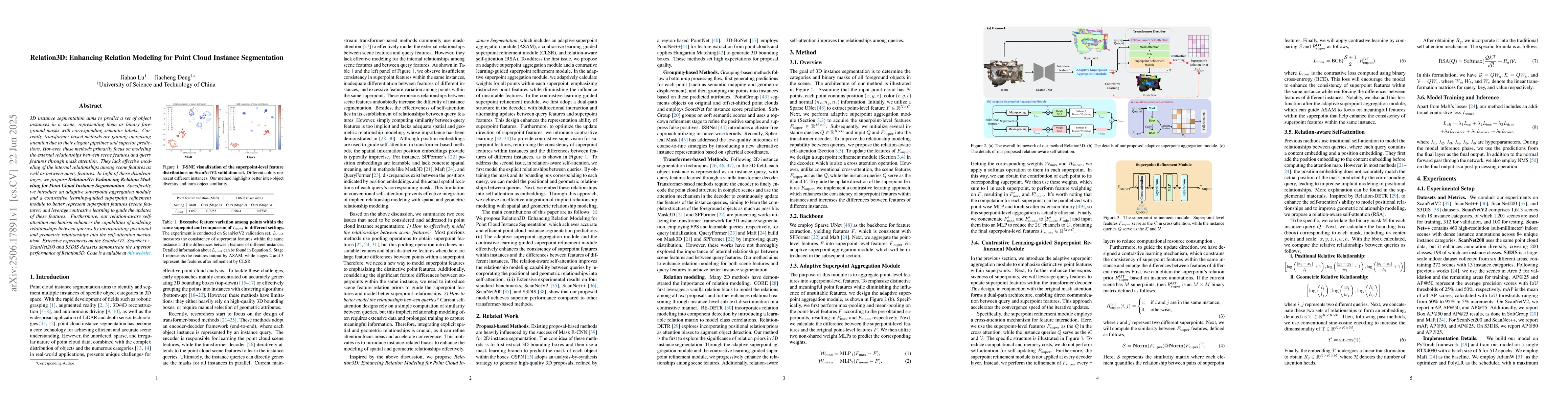 The paper introduces Relation3D, a method that improves 3D instance segmentation in point clouds. It addresses the limitations of transformer-based methods by incorporating adaptive superpoint aggregation, contrastive learning-guided refinement, and a relation-aware self-attention mechanism. Results show Relation3D outperforms existing methods on multiple datasets.