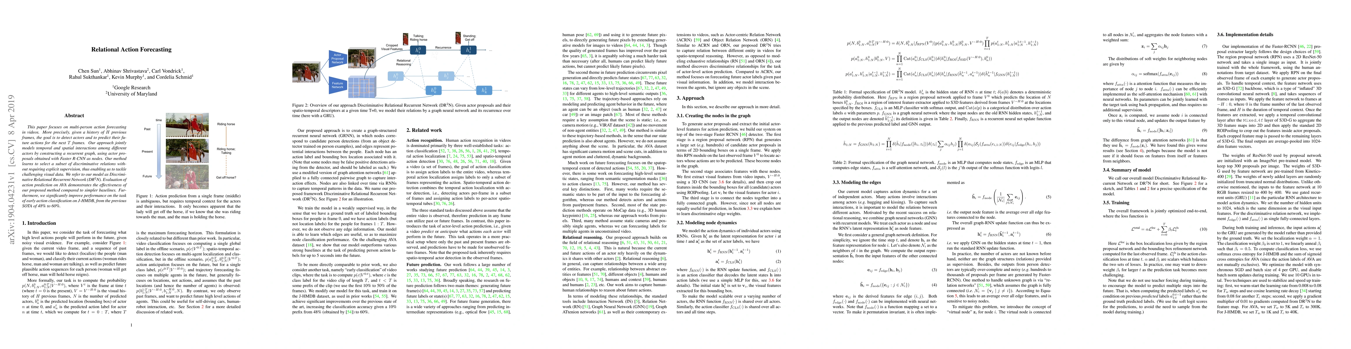 This paper focuses on multi-person action forecasting in videos. More precisely, given a history of H previous frames, the goal is to detect actors and to predict their future actions for the next T frames. Our approach jointly models temporal and spatial interactions among different actors by constructing a recurrent graph, using actor proposals obtained with Faster R-CNN as nodes. Our method learns to select a subset of discriminative relations without requiring explicit supervision, thus enabling us to tackle challenging visual data. We refer to our model as Discriminative Relational Recurrent Network (DRRN). Evaluation of action prediction on AVA demonstrates the effectiveness of our proposed method compared to simpler baselines. Furthermore, we significantly improve performance on the task of early action classification on J-HMDB, from the previous SOTA of 48% to 60%.