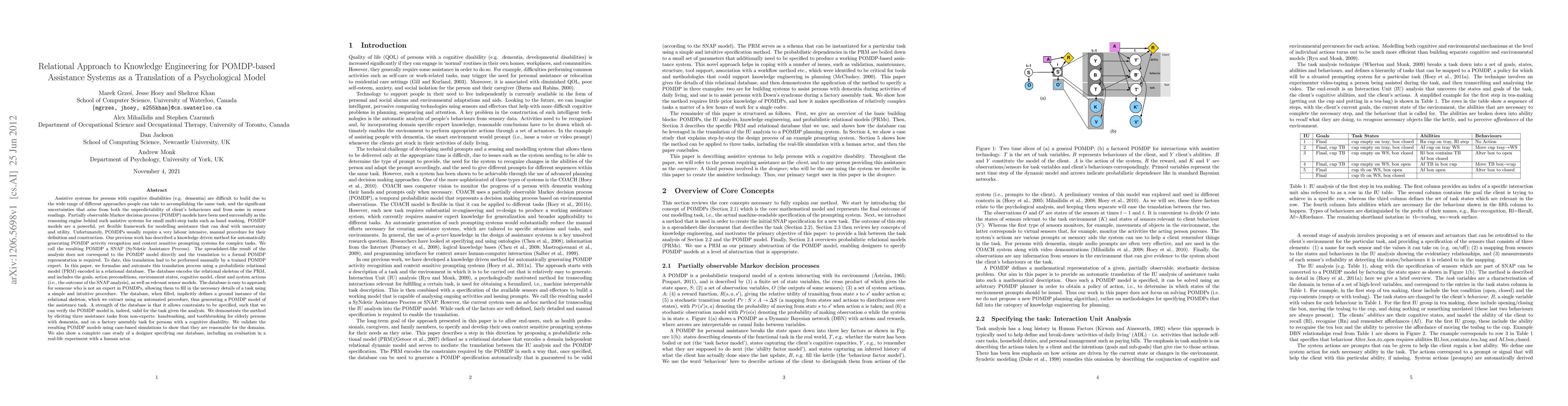 Assistive systems for persons with cognitive disabilities (e.g. dementia) are difficult to build due to the wide range of different approaches people can take to accomplishing the same task, and the significant uncertainties that arise from both the unpredictability of client's behaviours and from noise in sensor readings. Partially observable Markov decision process (POMDP) models have been used successfully as the reasoning engine behind such assistive systems for small multi-step tasks such as hand washing. POMDP models are a powerful, yet flexible framework for modelling assistance that can deal with uncertainty and utility. Unfortunately, POMDPs usually require a very labour intensive, manual procedure for their definition and construction. Our previous work has described a knowledge driven method for automatically generating POMDP activity recognition and context sensitive prompting systems for complex tasks. We call the resulting POMDP a SNAP (SyNdetic Assistance Process). The spreadsheet-like result of the analysis does not correspond to the POMDP model directly and the translation to a formal POMDP representation is required. To date, this translation had to be performed manually by a trained POMDP expert. In this paper, we formalise and automate this translation process using a probabilistic relational model (PRM) encoded in a relational database. We demonstrate the method by eliciting three assistance tasks from non-experts. We validate the resulting POMDP models using case-based simulations to show that they are reasonable for the domains. We also show a complete case study of a designer specifying one database, including an evaluation in a real-life experiment with a human actor.
