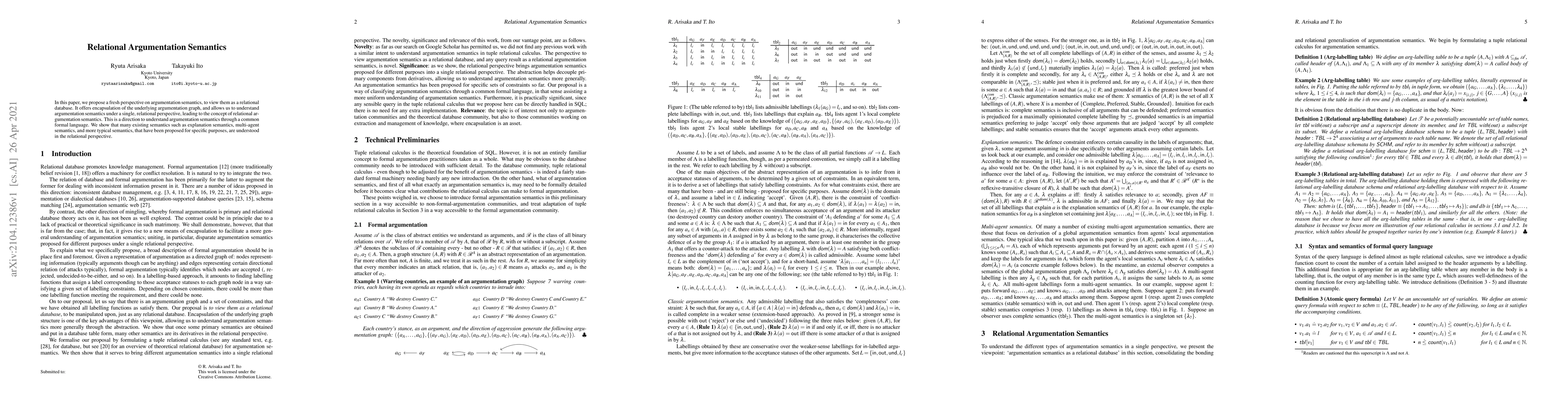 This paper introduces relational argumentation semantics, viewing argumentation semantics as a relational database that encapsulates the argumentation graph. It demonstrates how various existing semantics can be understood within this unified relational perspective.