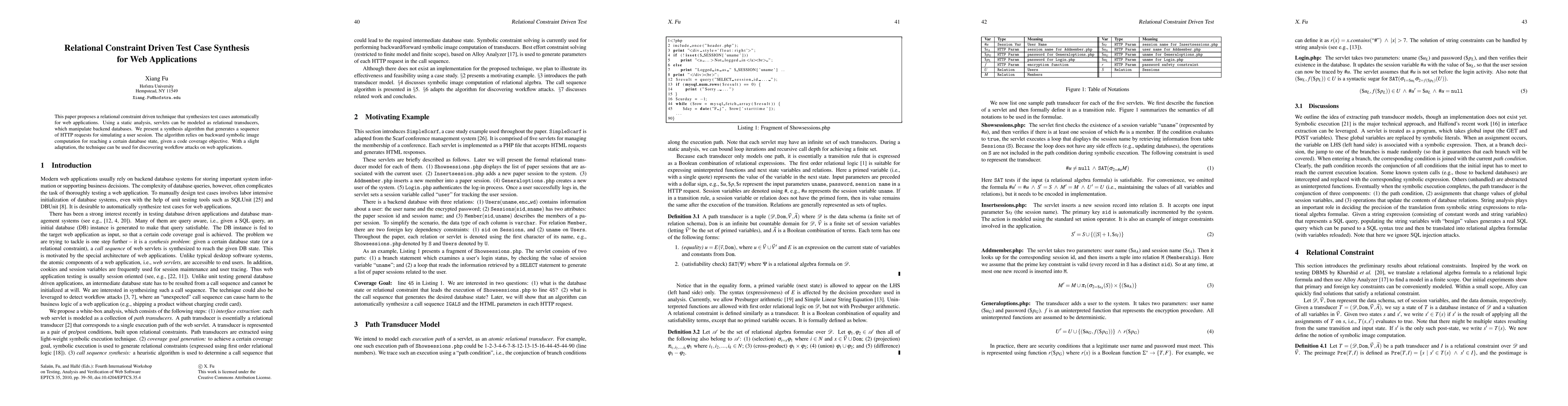 This paper proposes a relational constraint driven technique that synthesizes test cases automatically for web applications. Using a static analysis, servlets can be modeled as relational transducers, which manipulate backend databases. We present a synthesis algorithm that generates a sequence of HTTP requests for simulating a user session. The algorithm relies on backward symbolic image computation for reaching a certain database state, given a code coverage objective. With a slight adaptation, the technique can be used for discovering workflow attacks on web applications.