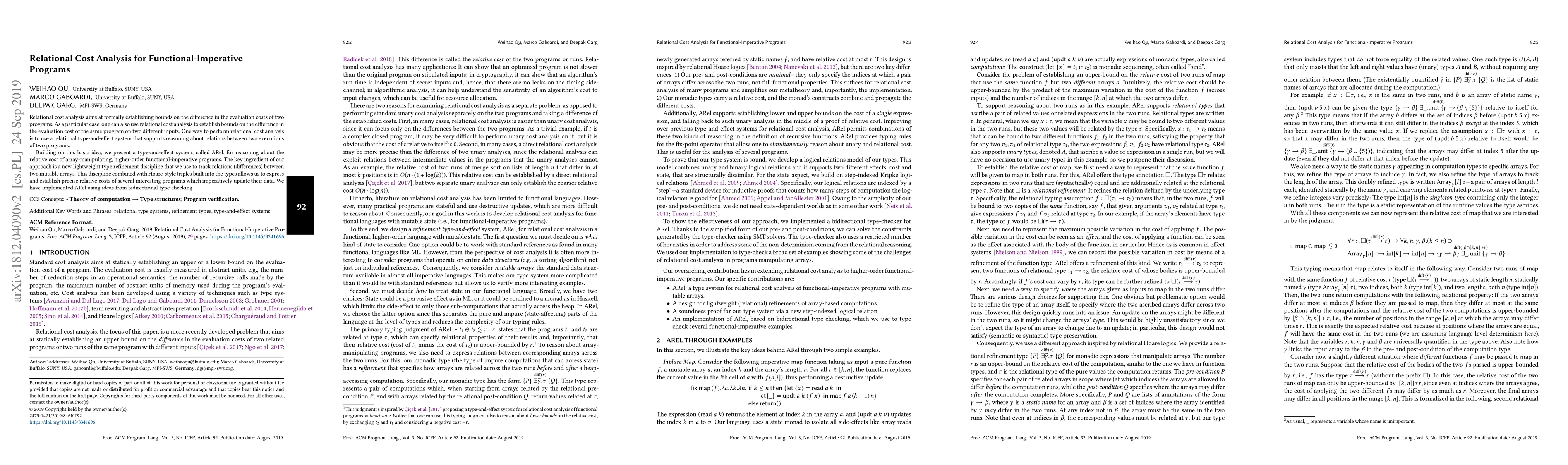 This paper introduces ARel, a type-and-effect system for relational cost analysis of functional-imperative programs, focusing on array manipulations. It employs a lightweight type refinement discipline to track differences between program executions, enabling precise relative cost comparisons.