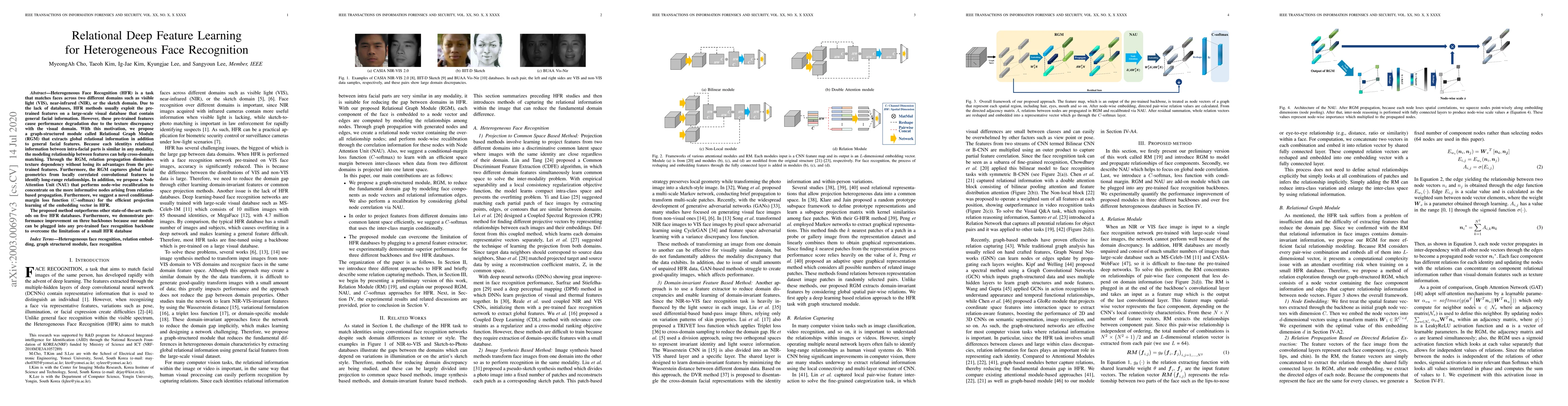 This paper proposes a Relational Deep Feature Learning method for Heterogeneous Face Recognition, introducing a Relational Graph Module (RGM) to extract global relational information and a Node Attention Unit (NAU) to focus on informative nodes. The method also employs a conditional-margin loss function (C-softmax) for effective embedding learning, achieving superior performance on multiple HFR databases and demonstrating adaptability to various backbones.