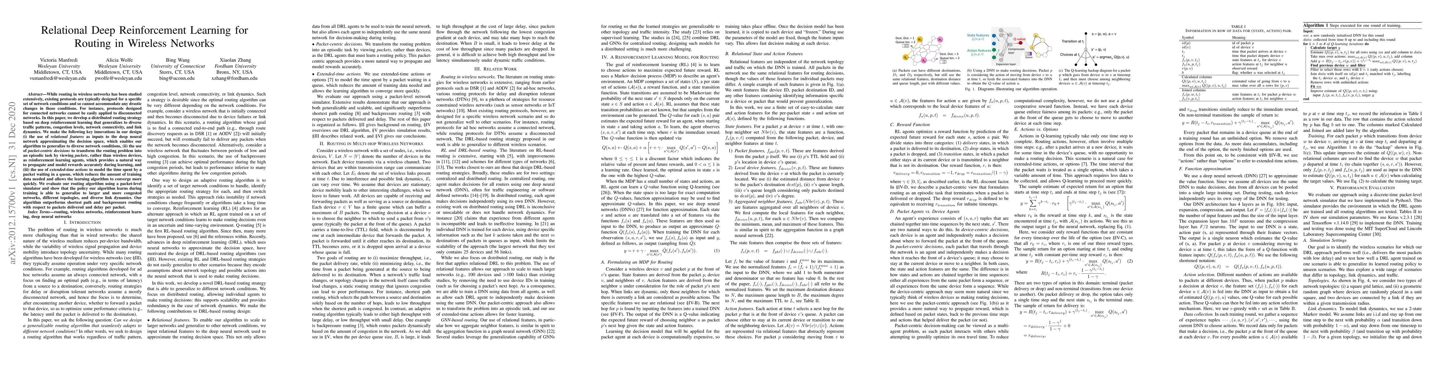 This paper proposes a distributed routing strategy using relational deep reinforcement learning to handle diverse traffic patterns and network conditions in wireless networks. The key innovations include relational features for generalization, packet-centric episodic reinforcement learning, and extended-time actions to expedite convergence. The algorithm outperforms traditional routing methods in terms of packet delivery and delay.