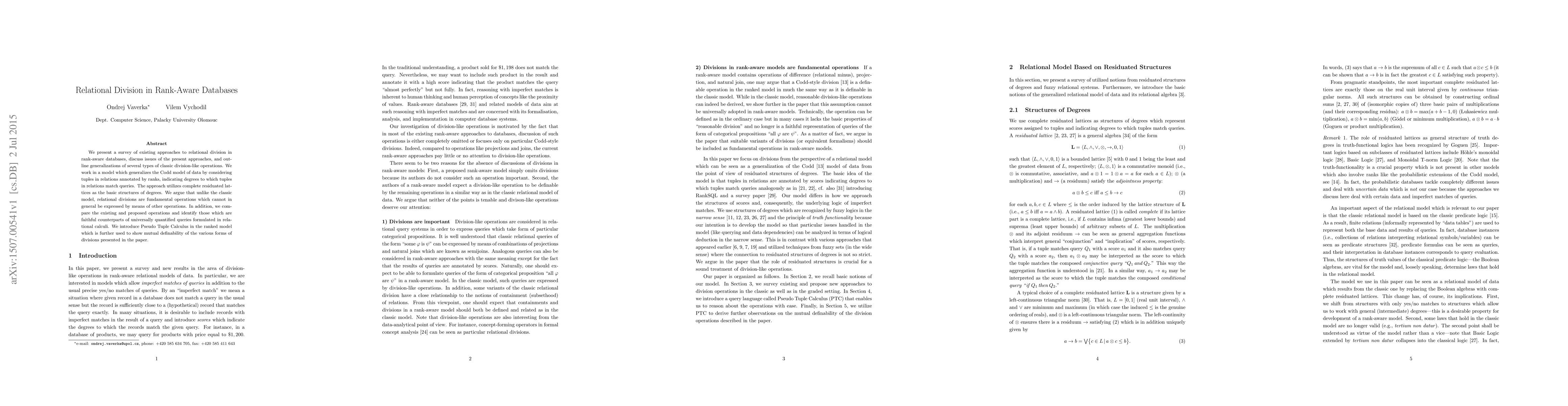 Researchers explore relational division in rank-aware databases, introducing a new framework for operations that match queries to degrees of tuple similarity. They argue that these operations are fundamental and cannot be expressed using other methods.
