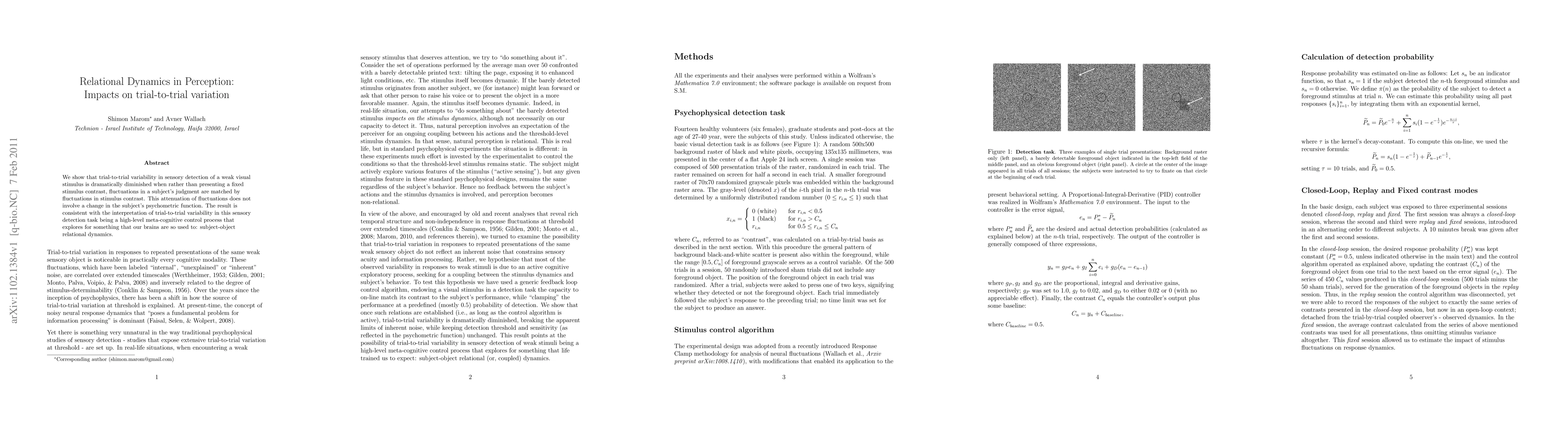 This study demonstrates that trial-to-trial variability in detecting a weak visual stimulus decreases when stimulus contrast fluctuates in sync with subjects' judgments, suggesting that this variability is a meta-cognitive process exploring subject-object relational dynamics rather than a change in perception.