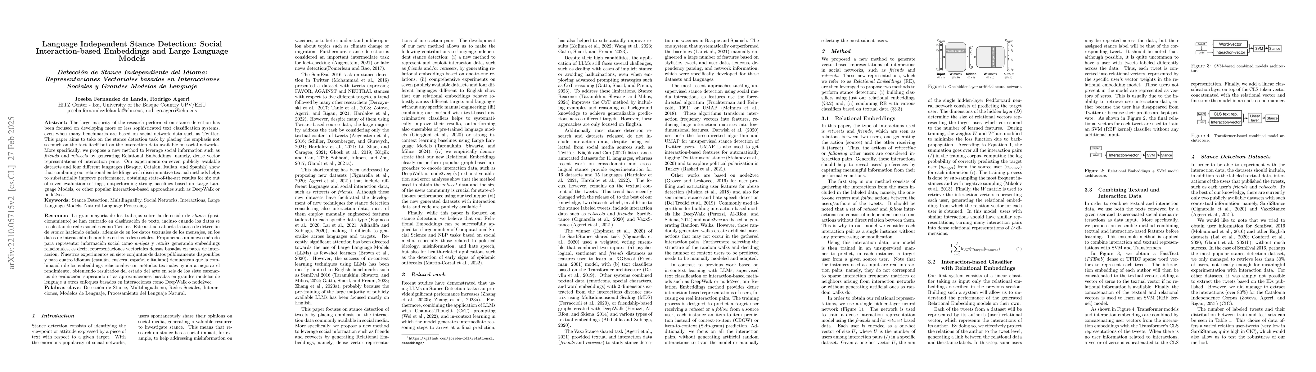 This paper proposes a novel method for language-independent stance detection by leveraging relational embeddings derived from social network interaction data, such as friends and retweets, to improve performance over traditional text classification approaches. Experiments across seven datasets and four languages show significant improvements, outperforming strong baselines.