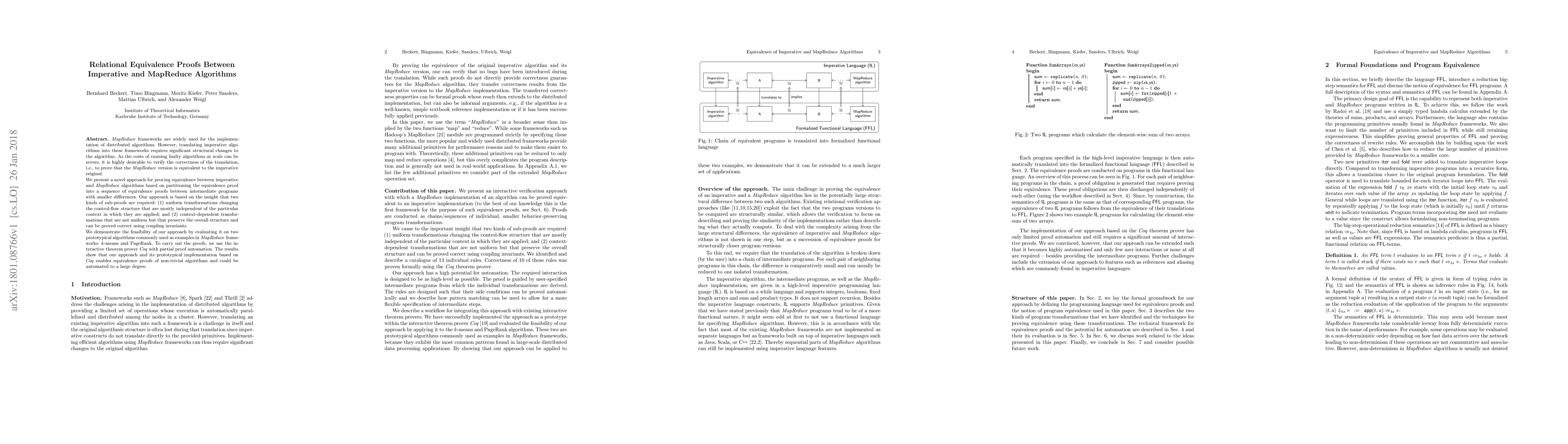 This paper presents a novel method for proving equivalence between imperative algorithms and their MapReduce implementations by breaking down the proof into smaller, manageable parts. The approach uses uniform and context-dependent transformations, verified through coupling invariants, and demonstrates feasibility on k-means and PageRank algorithms using Coq.