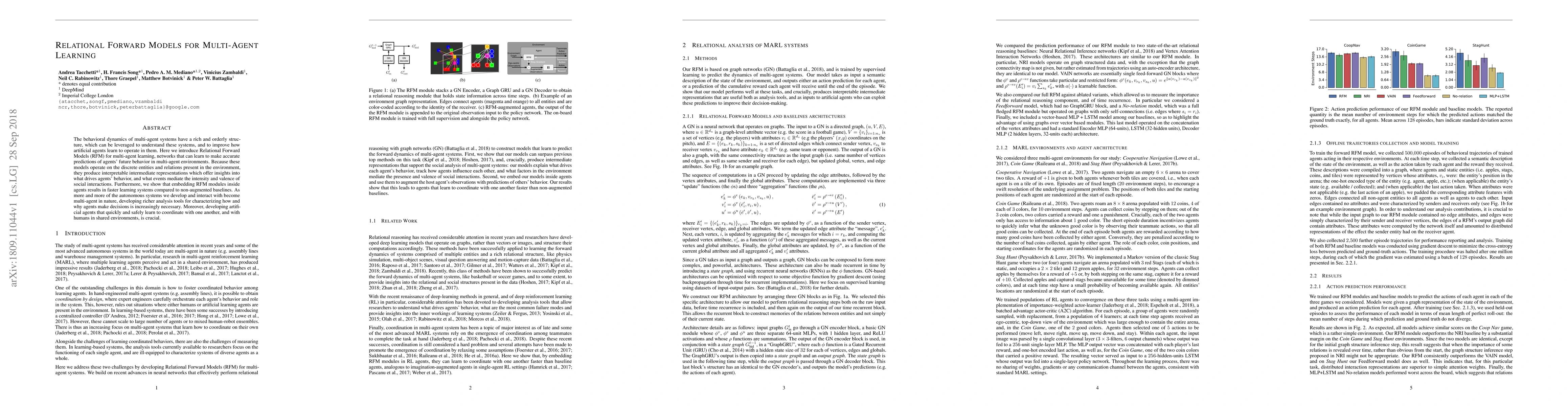 The behavioral dynamics of multi-agent systems have a rich and orderly structure, which can be leveraged to understand these systems, and to improve how artificial agents learn to operate in them. Here we introduce Relational Forward Models (RFM) for multi-agent learning, networks that can learn to make accurate predictions of agents' future behavior in multi-agent environments. Because these models operate on the discrete entities and relations present in the environment, they produce interpretable intermediate representations which offer insights into what drives agents' behavior, and what events mediate the intensity and valence of social interactions. Furthermore, we show that embedding RFM modules inside agents results in faster learning systems compared to non-augmented baselines. As more and more of the autonomous systems we develop and interact with become multi-agent in nature, developing richer analysis tools for characterizing how and why agents make decisions is increasingly necessary. Moreover, developing artificial agents that quickly and safely learn to coordinate with one another, and with humans in shared environments, is crucial.