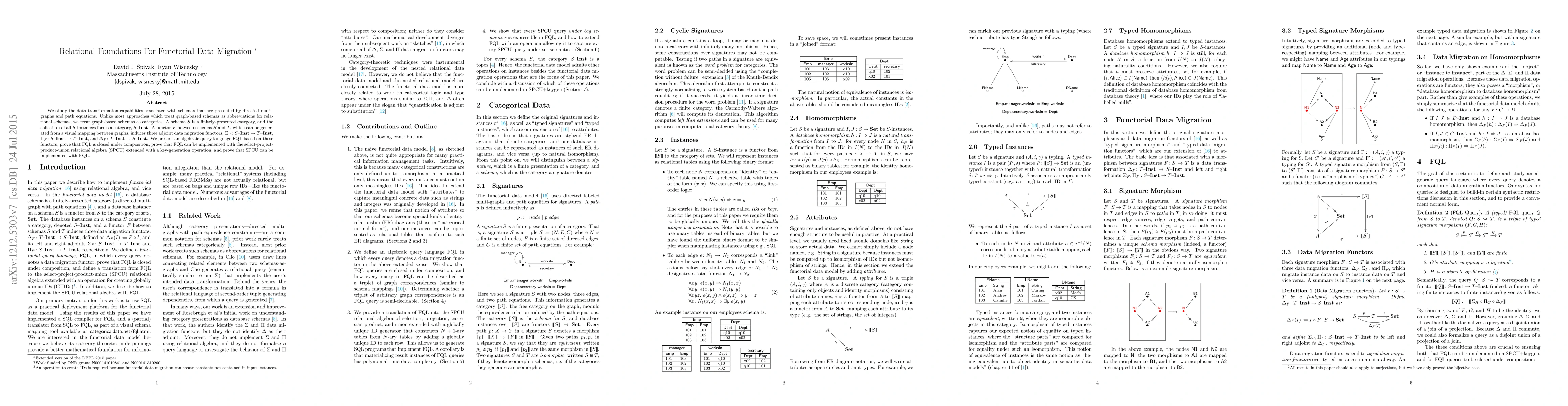 We study the data transformation capabilities associated with schemas that are presented by directed multi-graphs and path equations. Unlike most approaches which treat graph-based schemas as abbreviations for relational schemas, we treat graph-based schemas as categories. A schema $S$ is a finitely-presented category, and the collection of all $S$-instances forms a category, $S$-inst. A functor $F$ between schemas $S$ and $T$, which can be generated from a visual mapping between graphs, induces three adjoint data migration functors, $\Sigma_F:S$-inst$\to T$-inst, $\Pi_F: S$-inst $\to T$-inst, and $\Delta_F:T$-inst $\to S$-inst. We present an algebraic query language FQL based on these functors, prove that FQL is closed under composition, prove that FQL can be implemented with the select-project-product-union relational algebra (SPCU) extended with a key-generation operation, and prove that SPCU can be implemented with FQL.