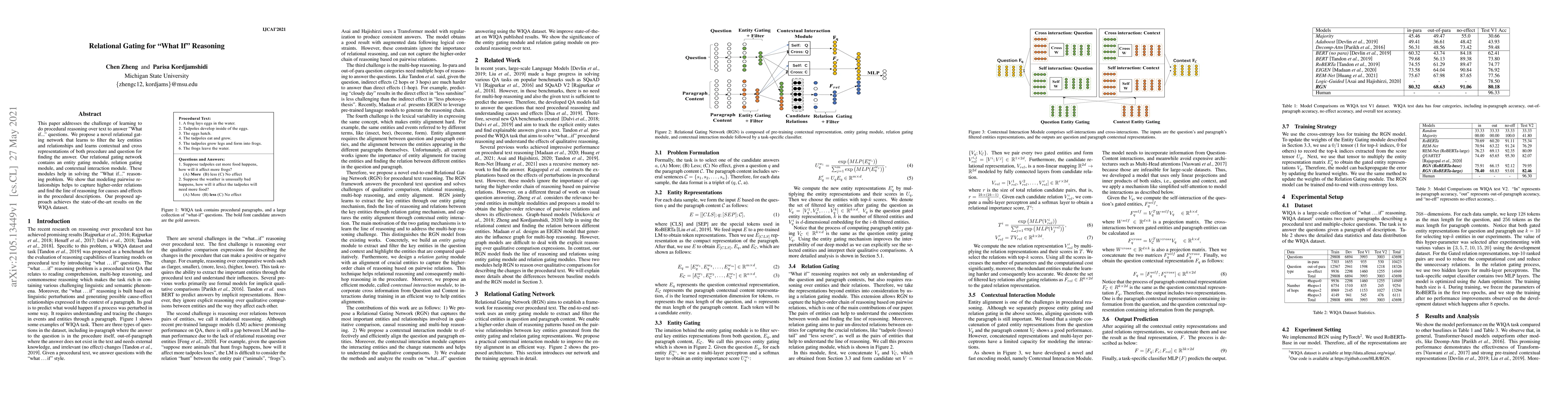 This paper introduces a relational gating network for procedural reasoning to answer "What if..." questions by filtering key entities and relationships, achieving state-of-the-art results on the WIQA dataset. The network's modules capture higher-order relations and determine causal reasoning in procedural texts.