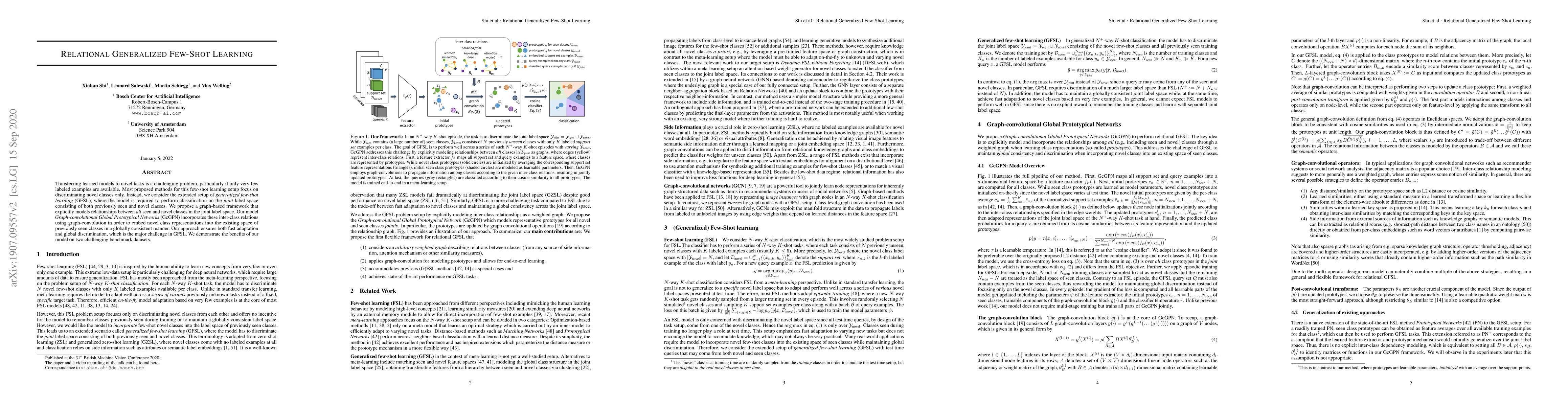 Transferring learned models to novel tasks is a challenging problem, particularly if only very few labeled examples are available. Although this few-shot learning setup has received a lot of attention recently, most proposed methods focus on discriminating novel classes only. Instead, we consider the extended setup of generalized few-shot learning (GFSL), where the model is required to perform classification on the joint label space consisting of both previously seen and novel classes. We propose a graph-based framework that explicitly models relationships between all seen and novel classes in the joint label space. Our model Graph-convolutional Global Prototypical Networks (GcGPN) incorporates these inter-class relations using graph-convolution in order to embed novel class representations into the existing space of previously seen classes in a globally consistent manner. Our approach ensures both fast adaptation and global discrimination, which is the major challenge in GFSL. We demonstrate the benefits of our model on two challenging benchmark datasets.