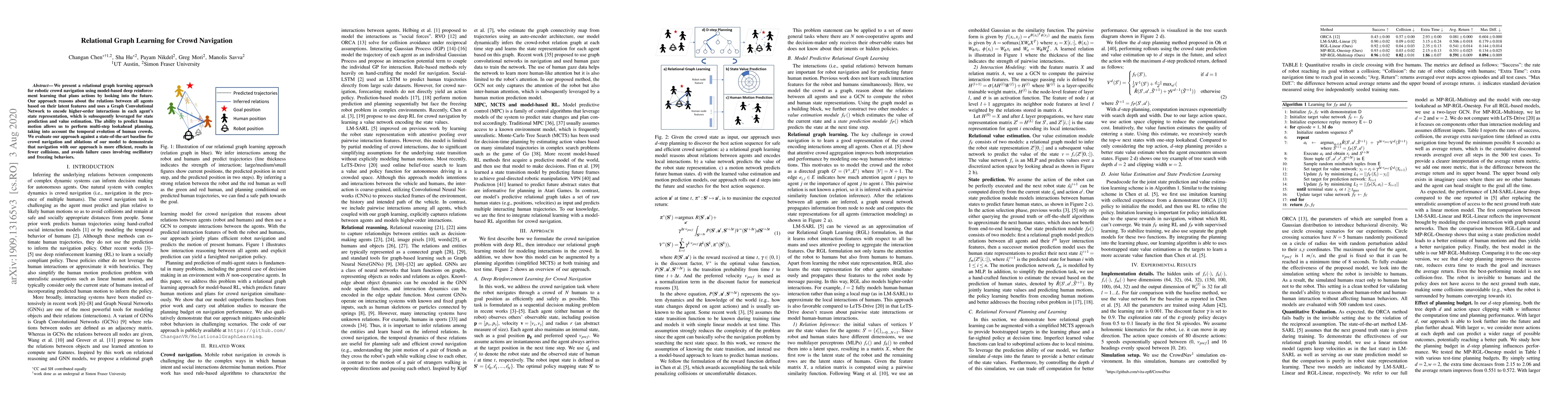 We present a relational graph learning approach for robotic crowd navigation using model-based deep reinforcement learning that plans actions by looking into the future. Our approach reasons about the relations between all agents based on their latent features and uses a Graph Convolutional Network to encode higher-order interactions in each agent's state representation, which is subsequently leveraged for state prediction and value estimation. The ability to predict human motion allows us to perform multi-step lookahead planning, taking into account the temporal evolution of human crowds. We evaluate our approach against a state-of-the-art baseline for crowd navigation and ablations of our model to demonstrate that navigation with our approach is more efficient, results in fewer collisions, and avoids failure cases involving oscillatory and freezing behaviors.