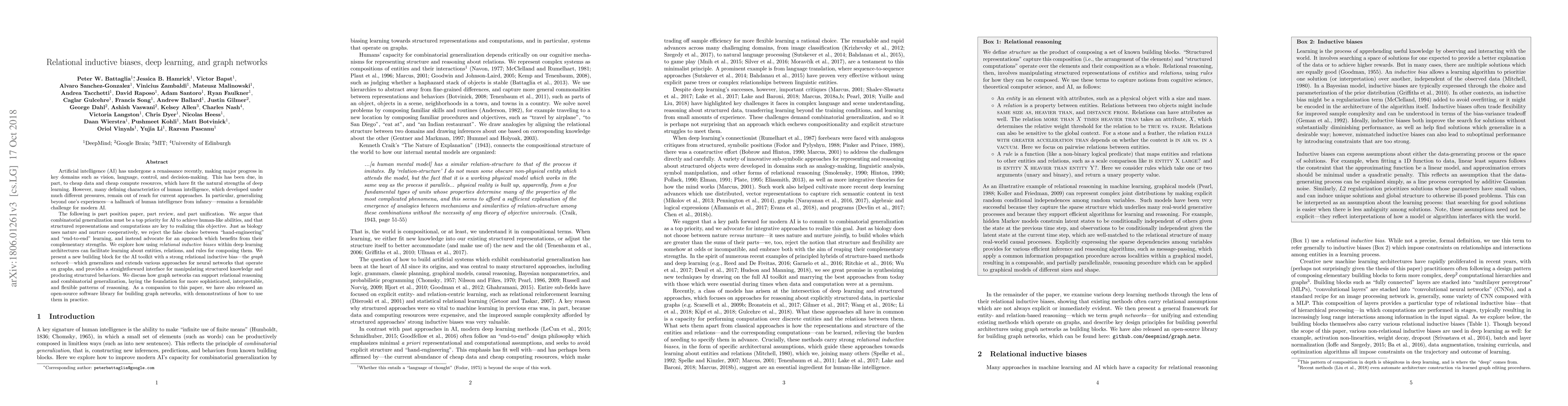 The paper presents a position paper, review, and unification, advocating for the use of relational inductive biases within deep learning architectures. It explores how graph networks, a new building block, can facilitate learning about entities, relations, and rules for composing them, supporting relational reasoning and combinatorial generalization.