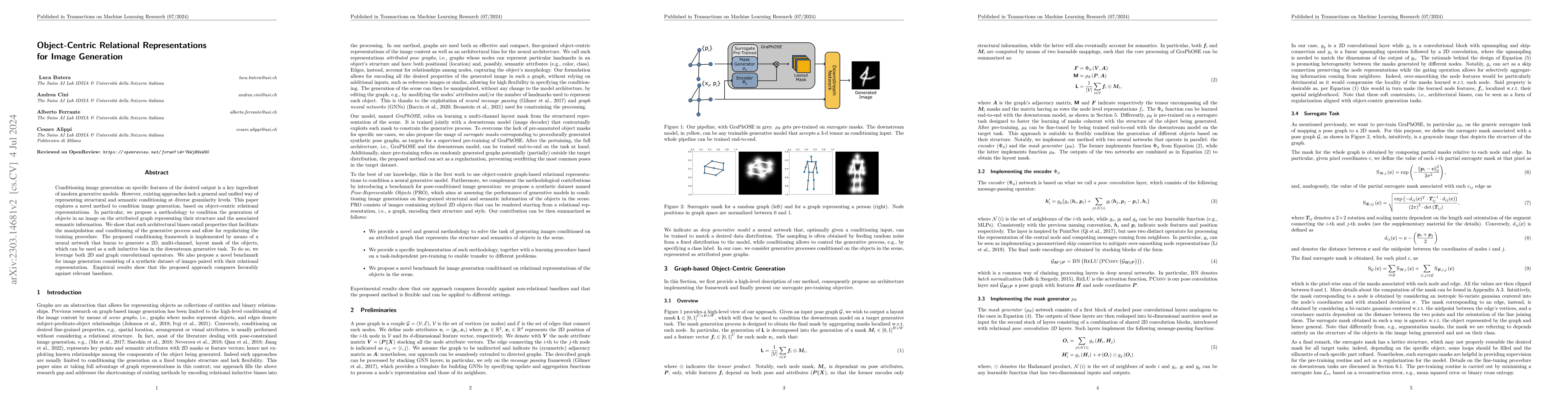 This paper introduces a novel method for conditioning image generation on object-centric relational representations, using attributed graphs to describe object structure and style. The proposed neural network architecture combines convolutional operators on both graph and 2D grid, enabling the generation of multi-channel object masks, which improves the generative process and training regularization, outperforming baselines in human pose-conditioned image generation.