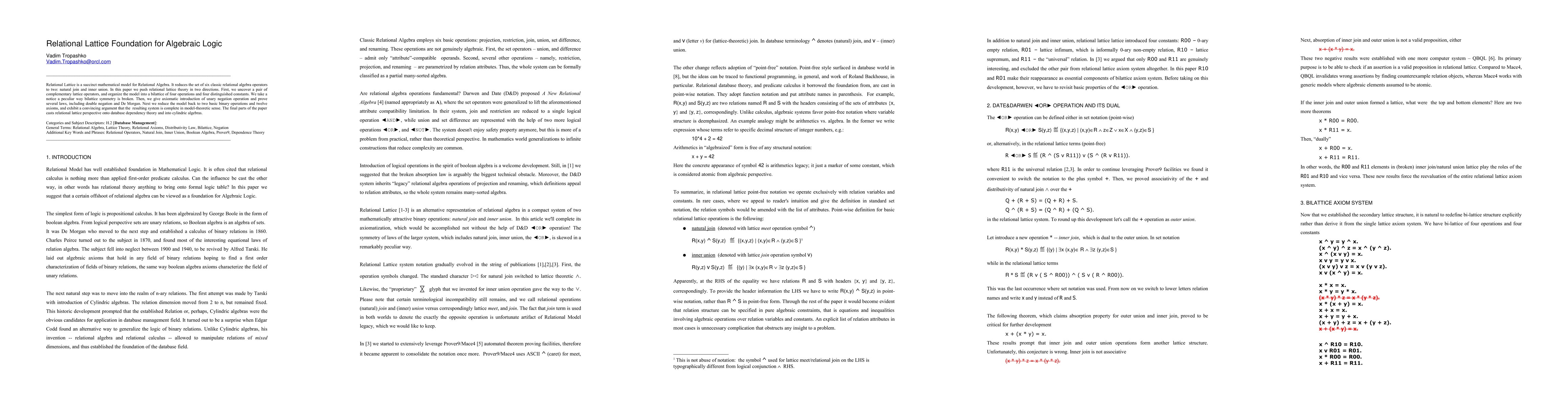 Relational Lattice is a succinct mathematical model for Relational Algebra. It reduces the set of six classic relational algebra operators to two: natural join and inner union. In this paper we push relational lattice theory in two directions. First, we uncover a pair of complementary lattice operators, and organize the model into a bilattice of four operations and four distinguished constants. We take a notice a peculiar way bilattice symmetry is broken. Then, we give axiomatic introduction of unary negation operation and prove several laws, including double negation and De Morgan. Next we reduce the model back to two basic binary operations and twelve axioms, and exhibit a convincing argument that the resulting system is complete in model-theoretic sense. The final parts of the paper casts relational lattice perspective onto database dependency theory and into cylindric algebras.