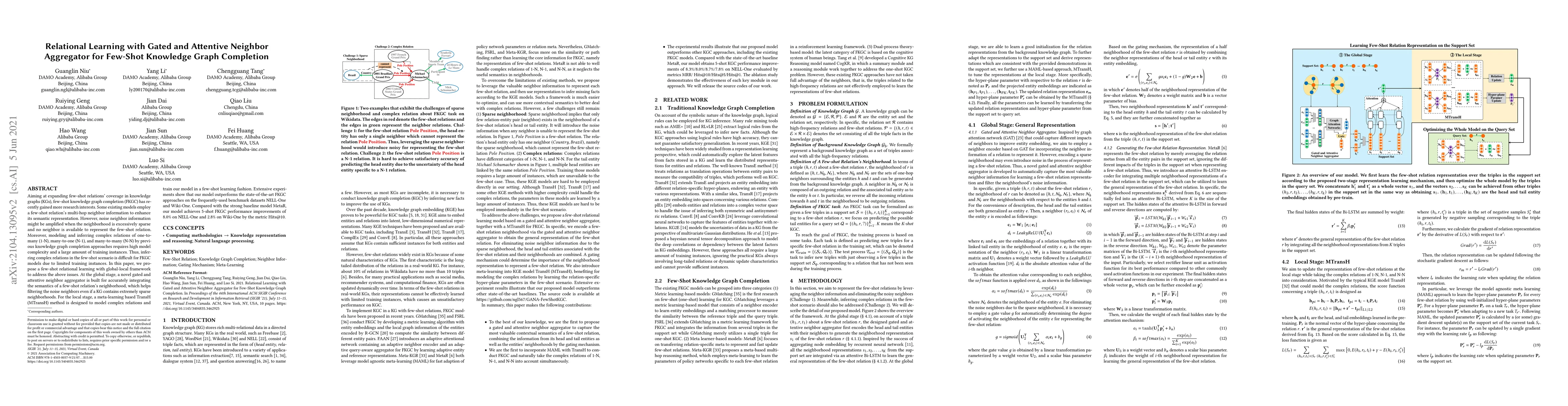 This paper proposes a novel framework for few-shot knowledge graph completion that integrates a gated and attentive neighbor aggregator to filter noise in sparse neighborhoods and a meta-learning based TransH method to model complex relations efficiently. The model outperforms state-of-the-art approaches on NELL-One and Wiki-One datasets, achieving significant improvements in 5-shot performance.