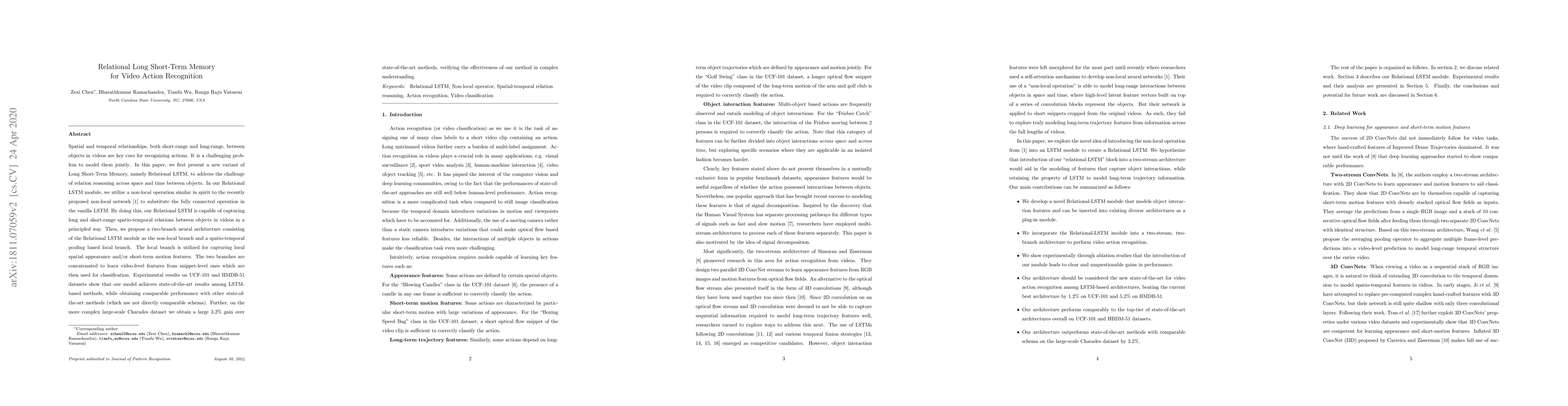 This paper introduces a Relational LSTM to model spatial and temporal relationships in videos for action recognition, achieving state-of-the-art results on UCF-101 and HMDB-51, and a 3.2% gain on Charades, demonstrating its effectiveness in complex scenarios.