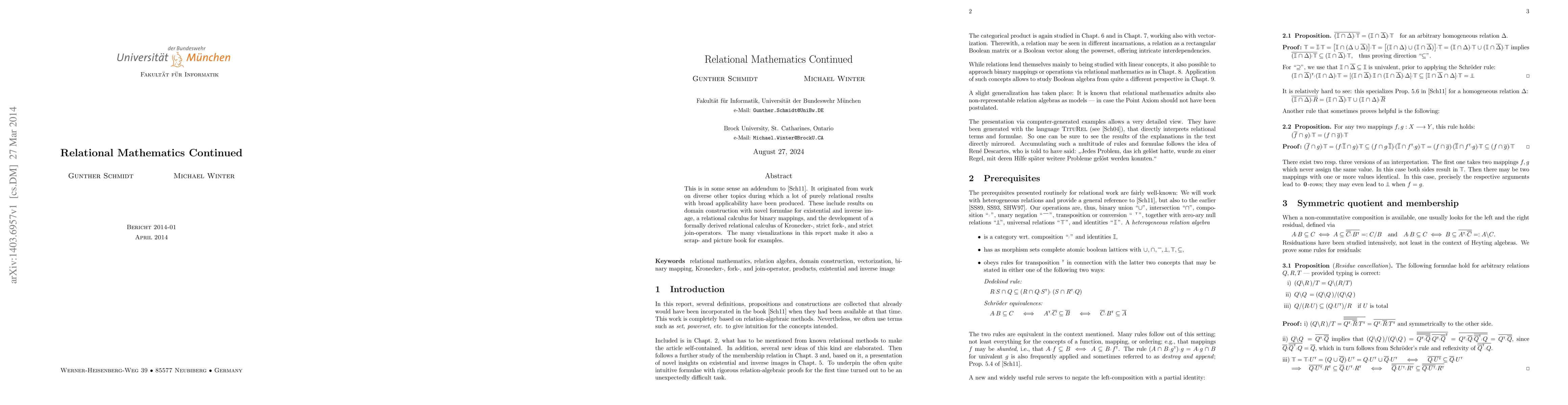This is in some sense an addendum to the book Relational Mathematics by the first-named author. It originated from work on diverse other topics during which a lot of purely relational results with broad applicability have been produced. These include results on domain construction with novel formulae for existential and inverse image, a relational calculus for binary mappings, and the development of a formally derived relational calculus of Kronecker-, strict fork-, and strict join-operators. The many visualizations in this report make it also a scrap- and picture book for examples.