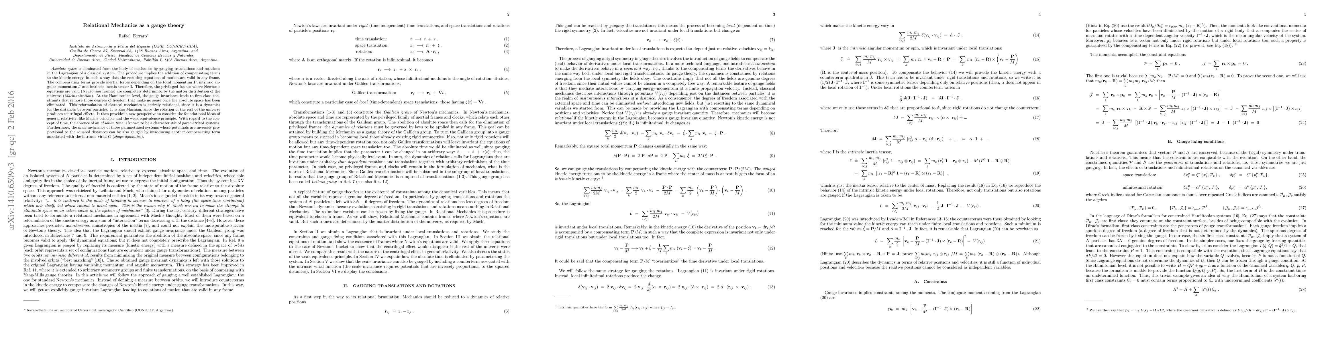 Absolute space is eliminated from the body of mechanics by gauging translations and rotations in the Lagrangian of a classical system. The procedure implies the addition of compensating terms to the kinetic energy, in such a way that the resulting equations of motion are valid in any frame. The compensating terms provide inertial forces depending on the total momentum P, intrinsic angular momentum J and intrinsic inertia tensor I. Therefore, the privileged frames where Newton's equations are valid (Newtonian frames) are completely determined by the matter distribution of the universe (Machianization). At the Hamiltonian level, the gauge invariance leads to first class constraints that remove those degrees of freedom that make no sense once the absolute space has been eliminated. This reformulation of classical mechanics is entirely relational, since it is a dynamics for the distances between particles. It is also Machian, since the rotation of the rest of the universe produces centrifugal effects. It then provides a new perspective to consider the foundational ideas of general relativity, like Mach's principle and the weak equivalence principle. With regard to the concept of time, the absence of an absolute time is known to be a characteristic of parametrized systems. Furthermore, the scale invariance of those parametrized systems whose potentials are inversely proportional to the squared distances can be also gauged by introducing another compensating term associated with the intrinsic virial G (shape-dynamics).