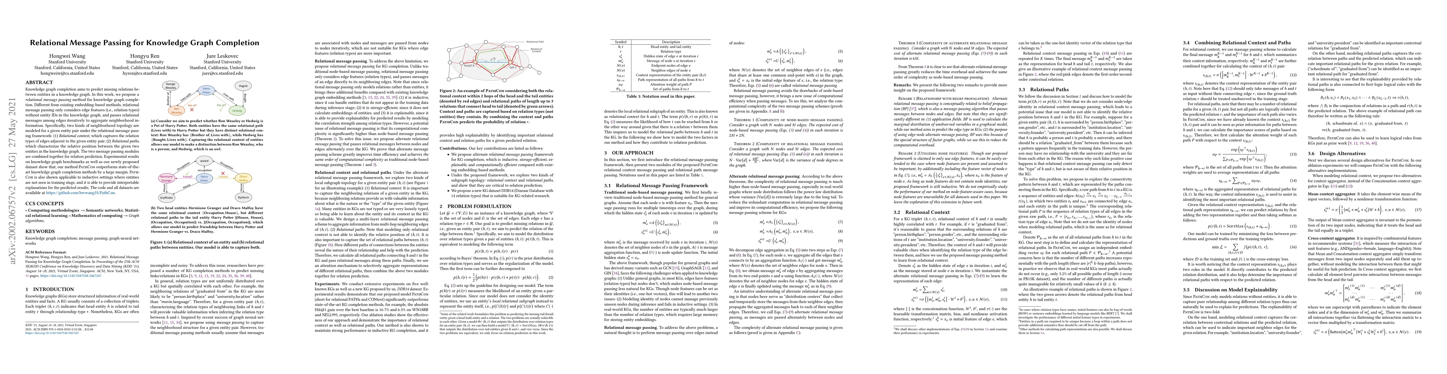 This paper introduces a relational message passing method for knowledge graph completion, focusing on edge features without entity IDs. It aggregates neighborhood information through two modules: relational context and relational paths, achieving superior performance and interpretability in both inductive and non-inductive settings.
