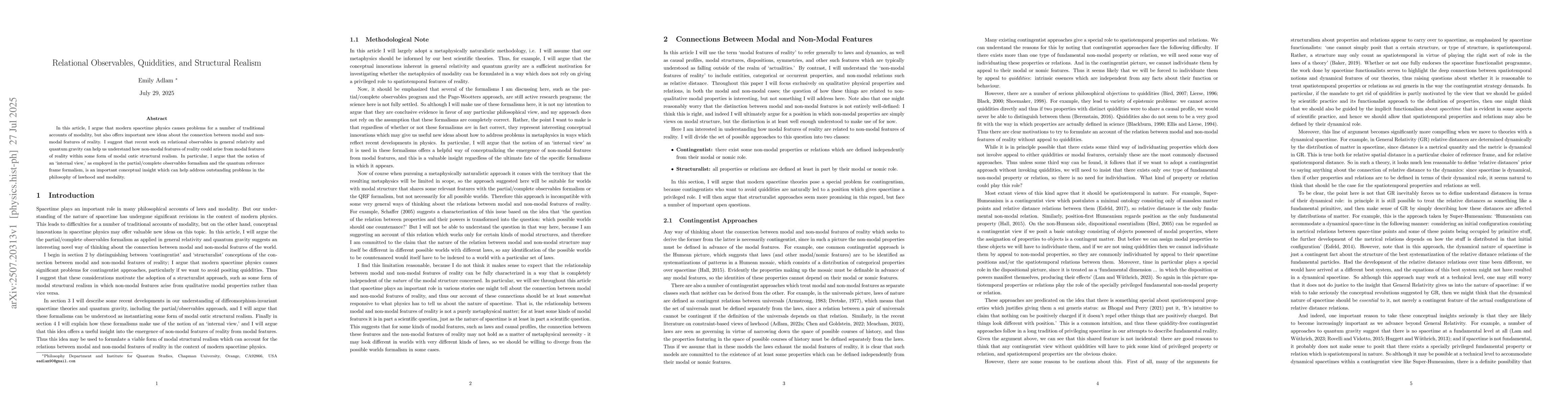 In this article, I argue that modern spacetime physics causes problems for a number of traditional accounts of modality, but also offers important new ideas about the connection between modal and non-modal features of reality. I suggest that recent work on relational observables in general relativity and quantum gravity can help us understand how non-modal features of reality could arise from modal features of reality within some form of modal ontic structural realism. In particular, I argue that the notion of an `internal view,' as employed in the partial/complete observables formalism and the quantum reference frame formalism, is an important conceptual insight which can help address outstanding problems in the philosophy of lawhood and modality.